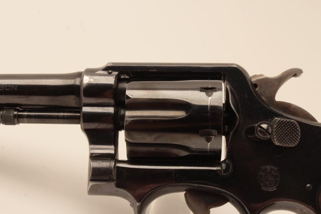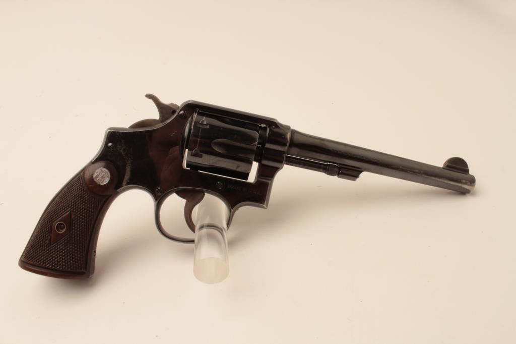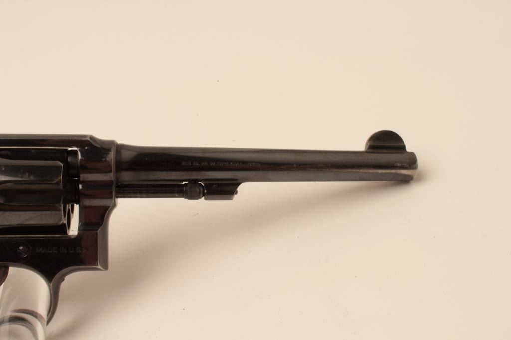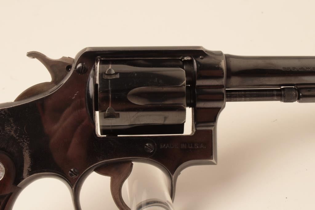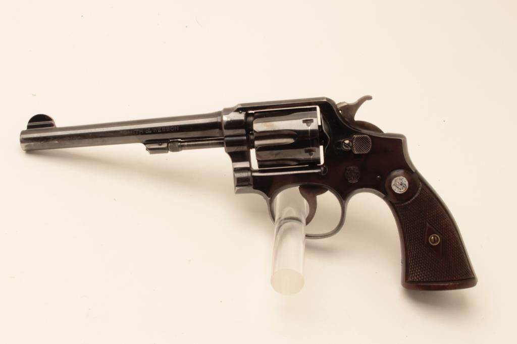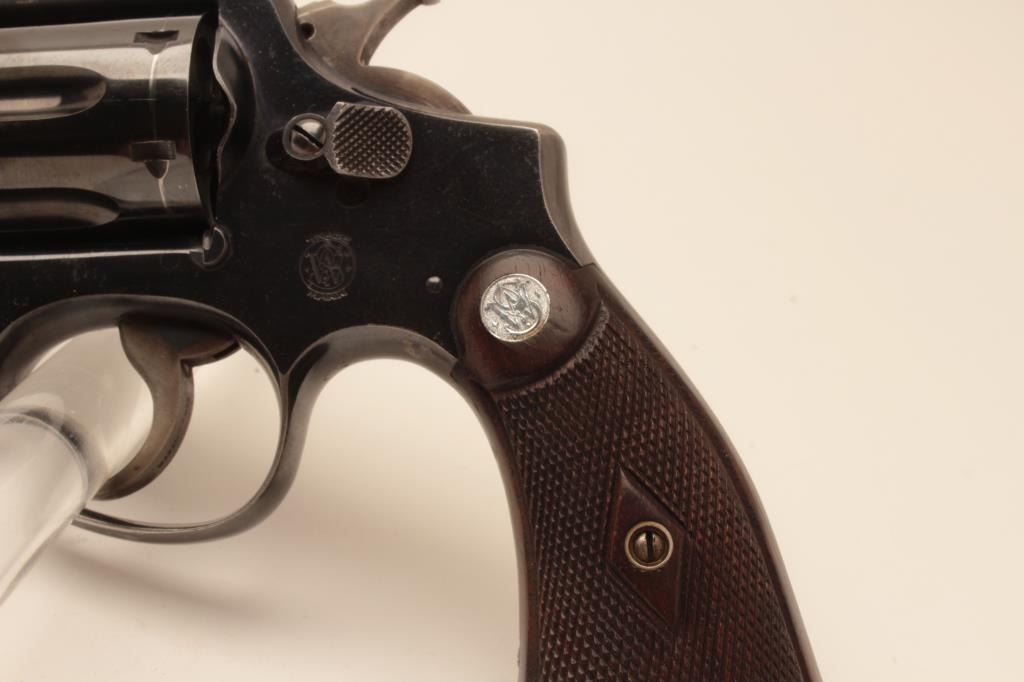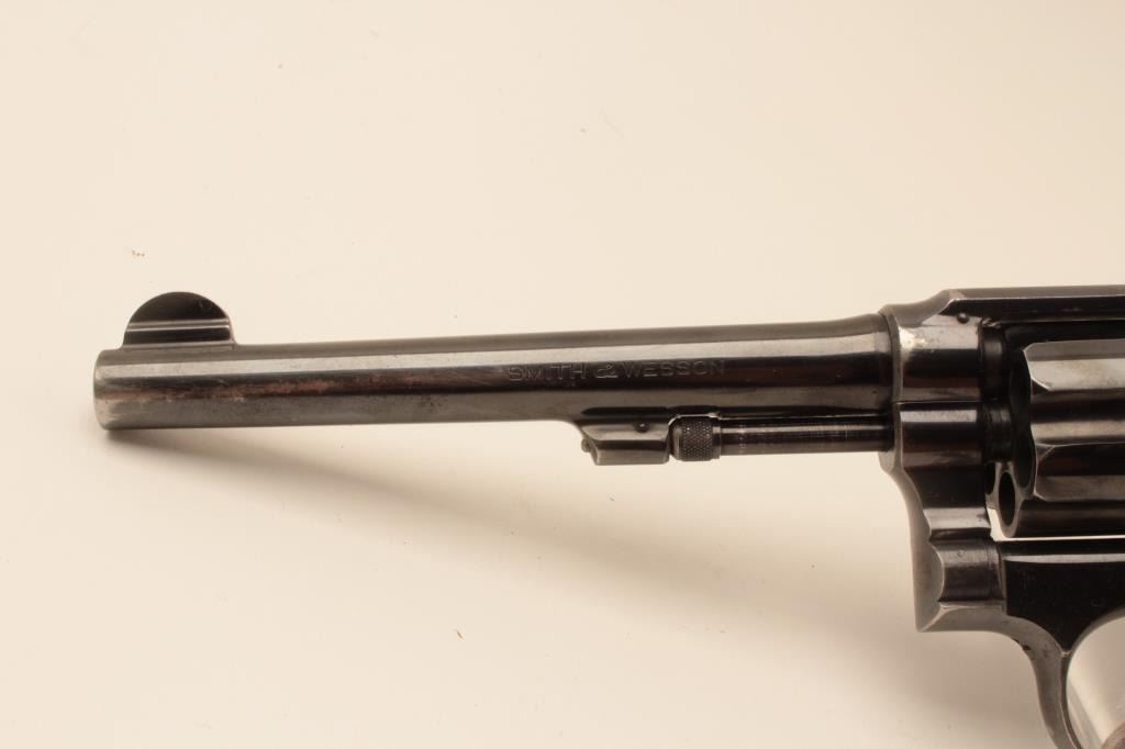 Smith & Wesson hand ejector DA 5 screw revolver, .38 Special caliber, 6” barrel, blued finish, checkered wood medallion grips, S/N 627941; overall fine condition with majority of original finish, holster wear tothe finish on both sides of barrel front end, fine bore, crisp action, sharp markings and fine grips. (C&R). Est.: $300-$600.