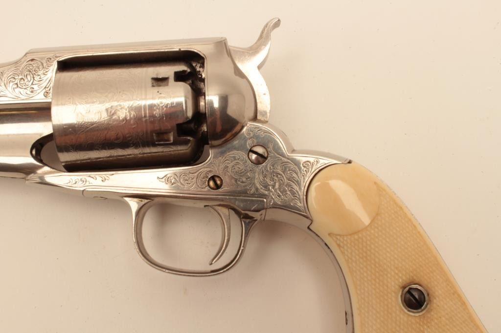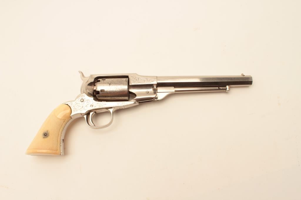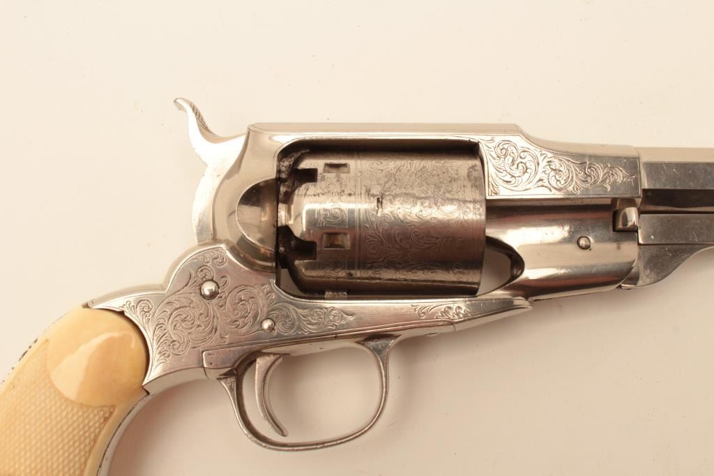 Remington “Beals” patent .36 caliber percussion Navy revolver with period scroll engraving, etched cylinder, and checkered ivory grips, S/N 4303. Old re-nickeled finish of which 98% remains. The cylinder shows acrack half way back on 1 cylinder. Absolutely authentic period engraving, grips and similar to the example illustrated in Moldenauer collection catalog. (Antique) Est.: $2100-4200