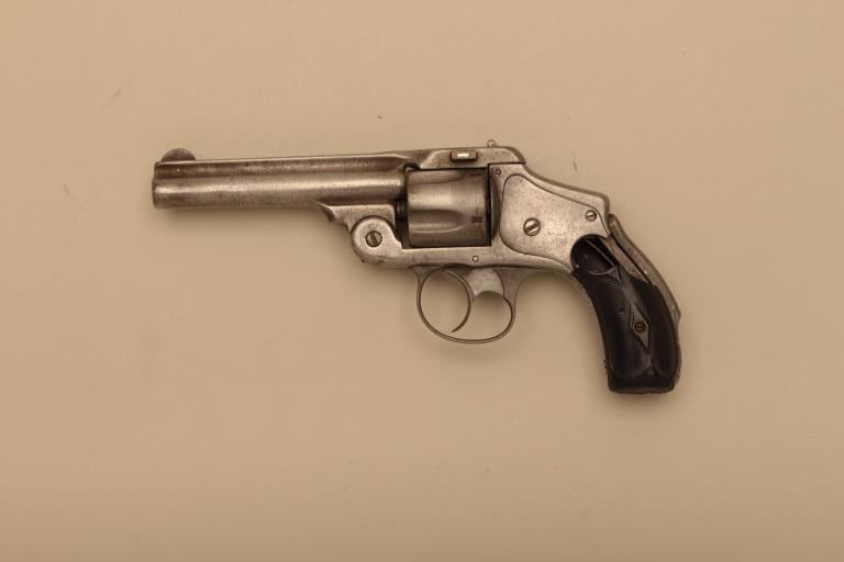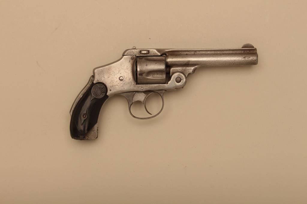 Early Smith & Wesson Safety New Departure First Model DA revolver, .38 S&W caliber, 4” barrel, grey patina to metal surfaces, checkered hard rubber grips, S/N 815; overall rough condition with scattered pinprickpitting, action is intermittently working, worn and broken grips; a hard New Departure to find in any condition as they were made in 1887 and limited to only about 5,125 produced. (Antique). Est.:$200-$400.