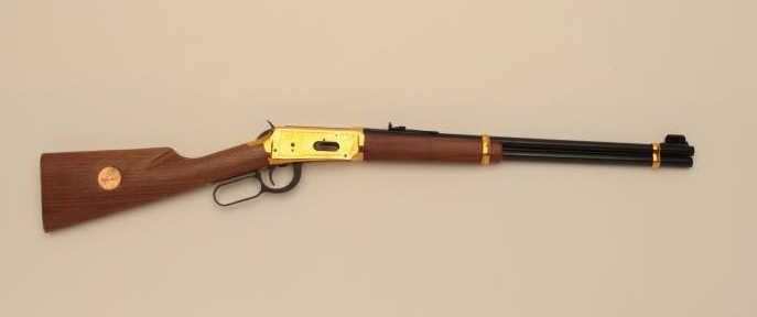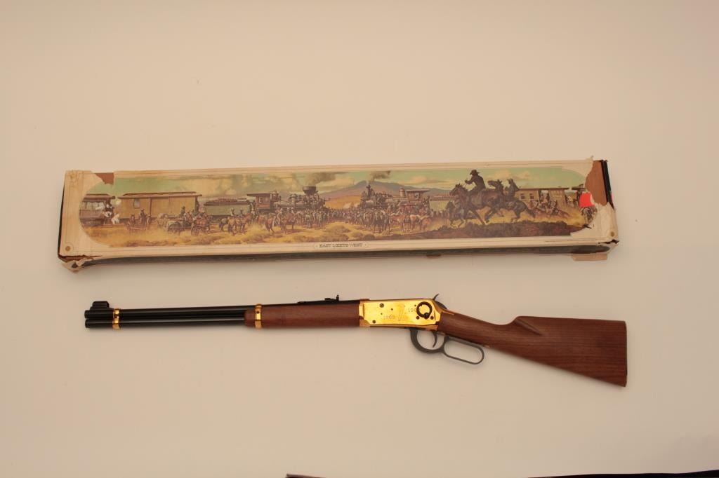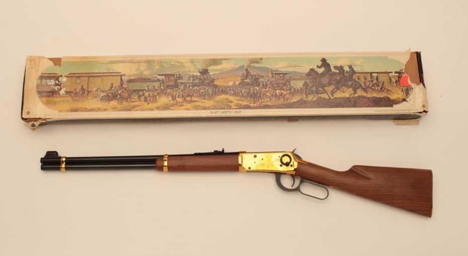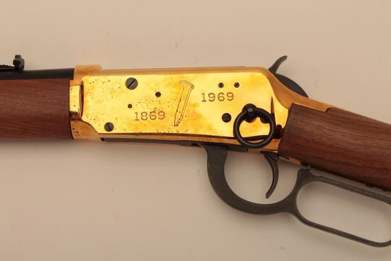 Winchester Golden Spike Model Commemorative carbine in .30-30 caliber, S/N GS55054. Excellent to mint condition in box with slip cover. The slip cover is tattered with rips and losses. The inside box is excellent.99.9% to new with no evidence of use. Almost 50 years old already! Commemorates joining the railroads in 1869. (C&R) Est.: $350-$700