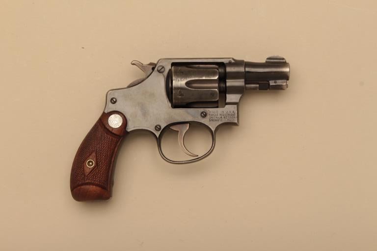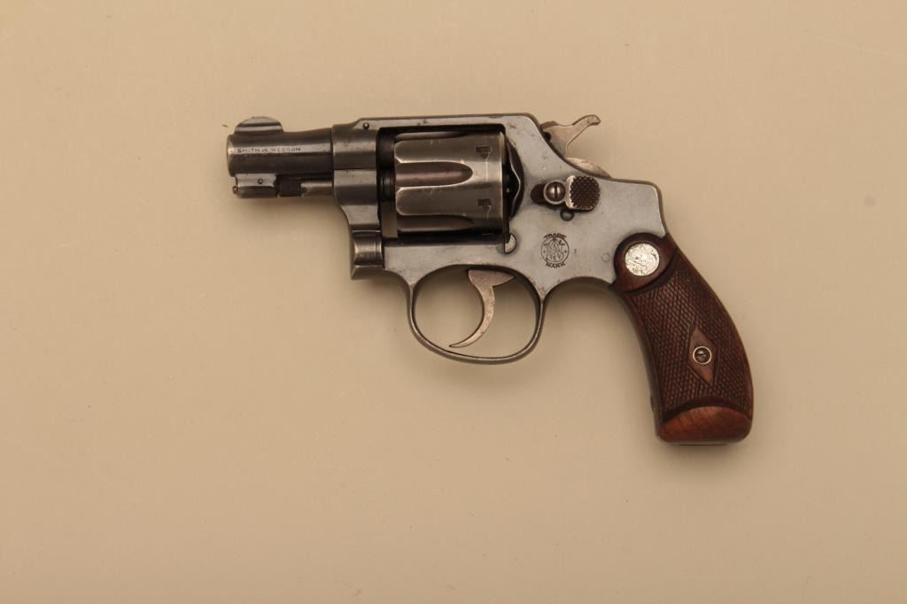 Smith & Wesson Terrier Model 5 screw DA hand ejector revolver, .32 Long caliber, 2” barrel, blued finish, checkered wood medallion grips, S/N 521866; overall very good to near fine showing majority of mutedblued finish to metal surfaces, very good bore, crisp action, very good markings and grips. (C&R). Est.: $300-$600.