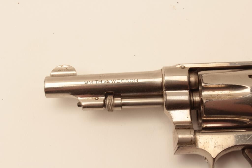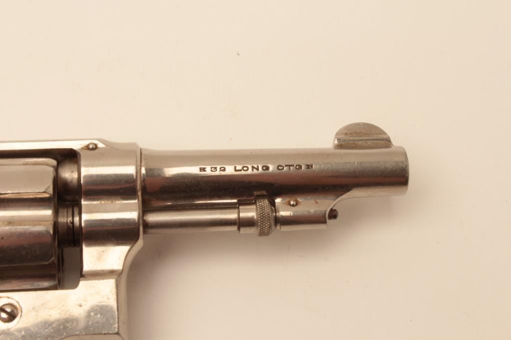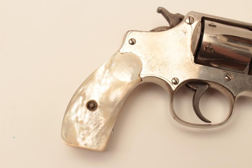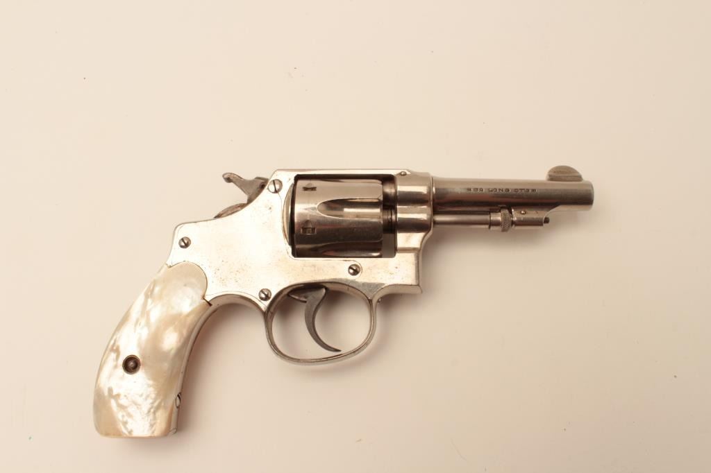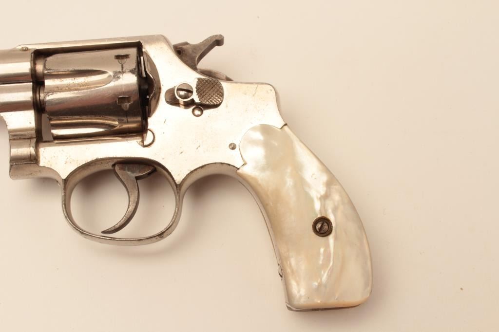 Smith & Wesson Hand Ejector DA revolver, 5 screw, .32 Long caliber, 3.25” barrel, nickel finish, pearl grips, S/N 272742; overall fine condition showing majority of original nickel finish, fine bore, action, markingsand iridescent pearl grips. (C&R). Est.: $350-$700.