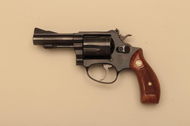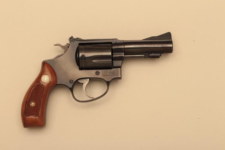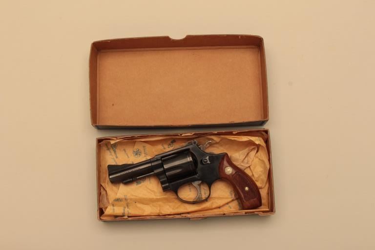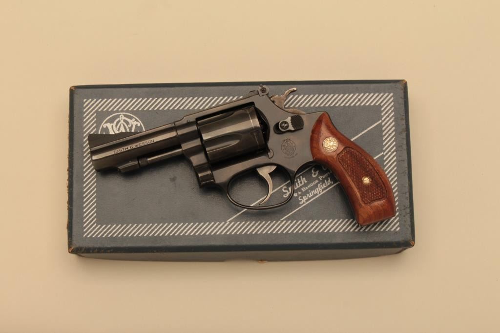 Smith & Wesson Model 36-1 DA revolver, .38 caliber, 3” heavy barrel, blued finish, checkered wood medallion grips, S/N J360954; overall like new condition and accompanied by a two piece factory cardboard box with endlabel numbered to this gun. (Modern/NO CAL. SALE). Est.: $350-$700.
