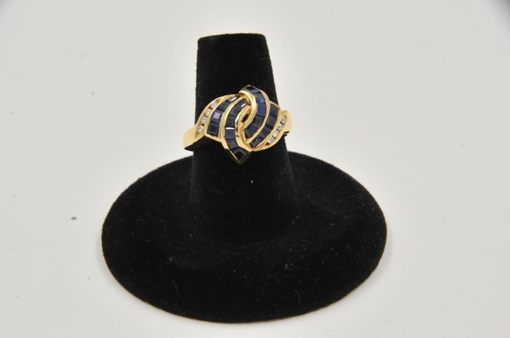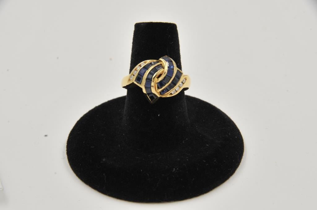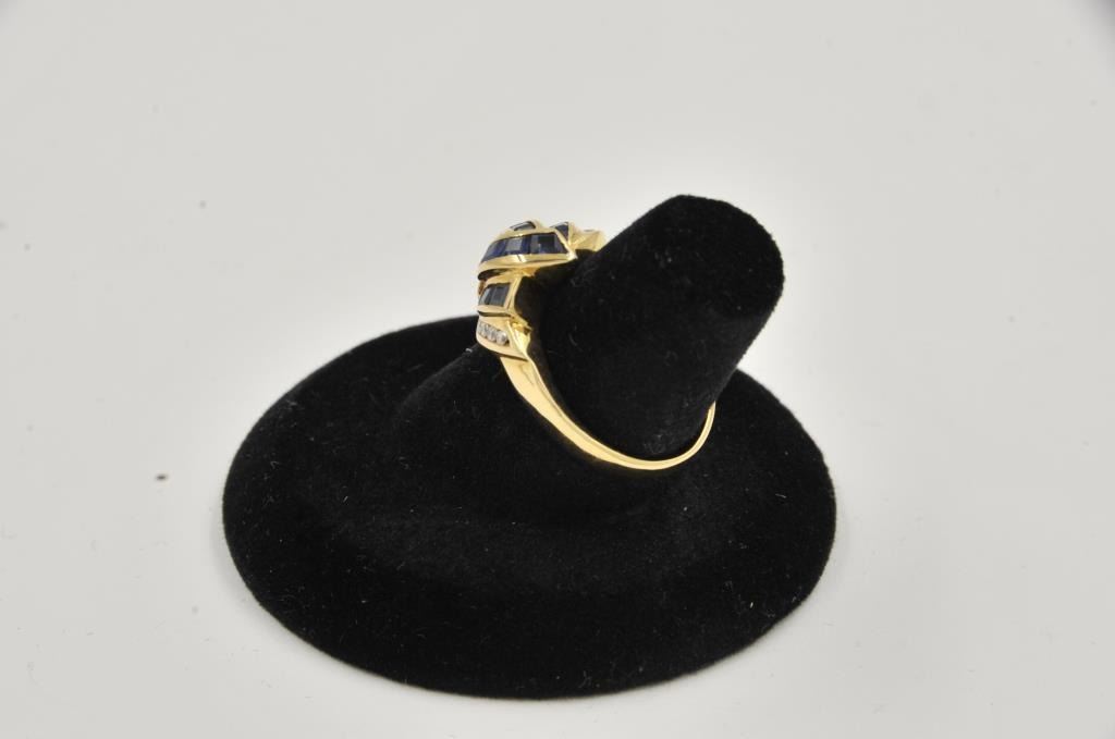 one retro designed ring in 18k yellow gold set with baguette sapphires and diamonds Est:$500-600