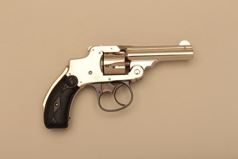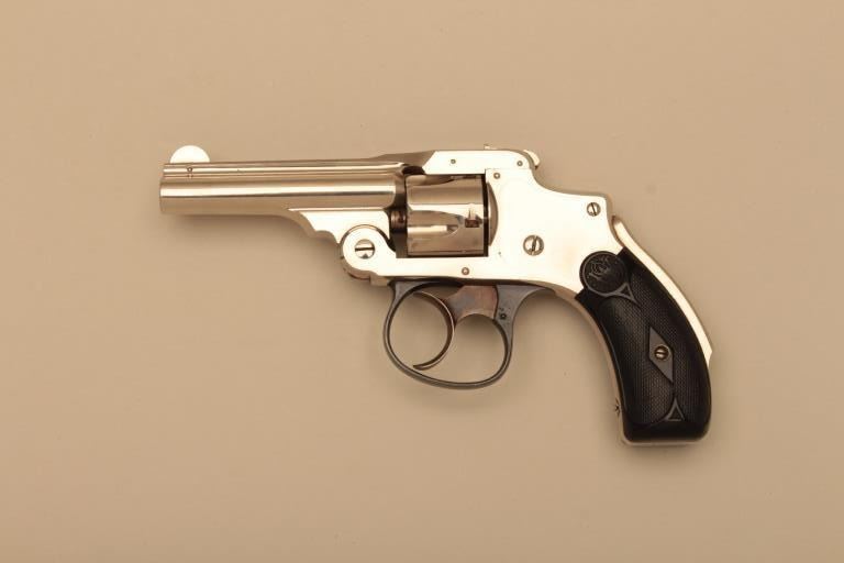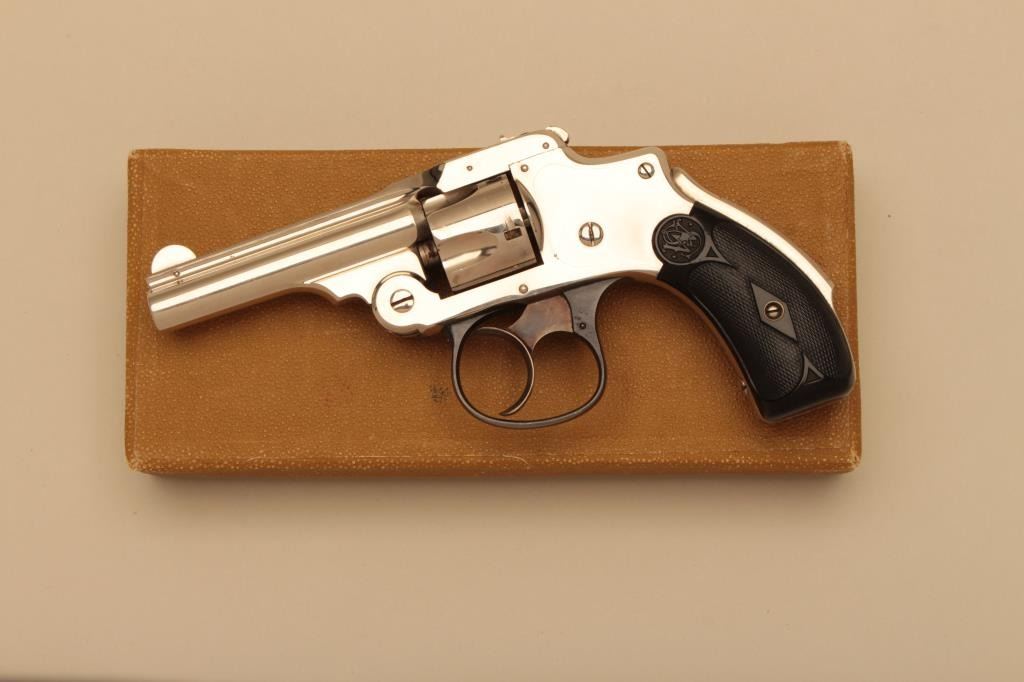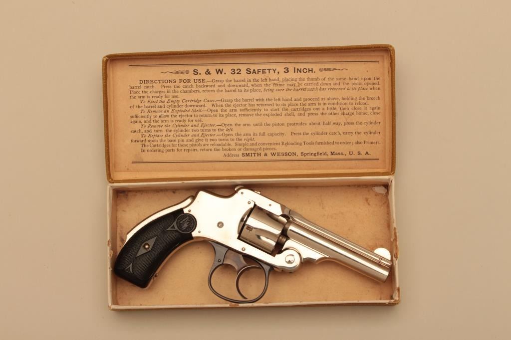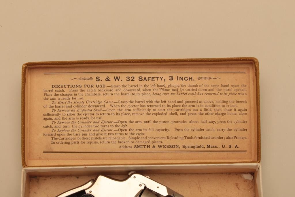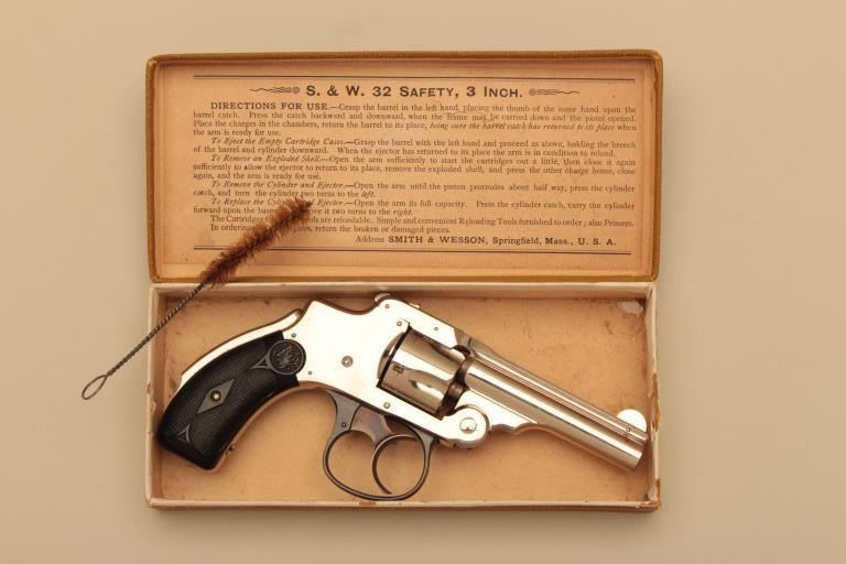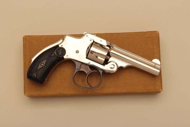 Smith & Wesson New Departure (“Safety Hammerless”) DA top break revolver, .32 caliber, 3” barrel, nickel finish, checkered hard rubber grips, S/N 48848; overall near new condition with factory fabric coveredcardboard box with cleaning brush. (Antique). Est.: $350-$700.