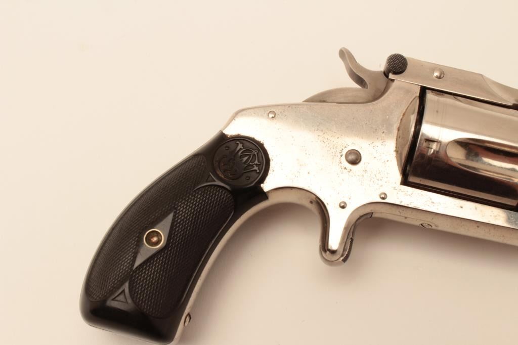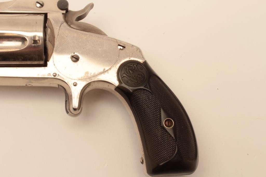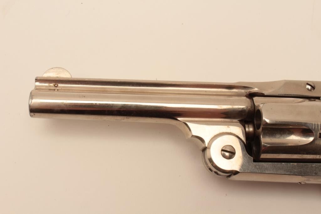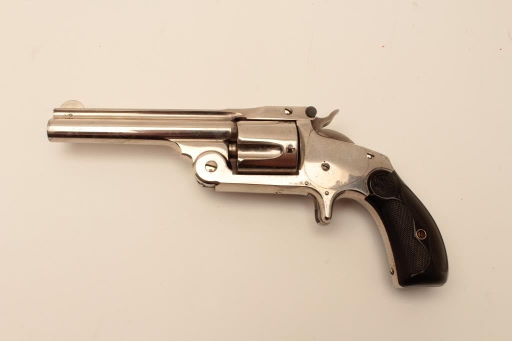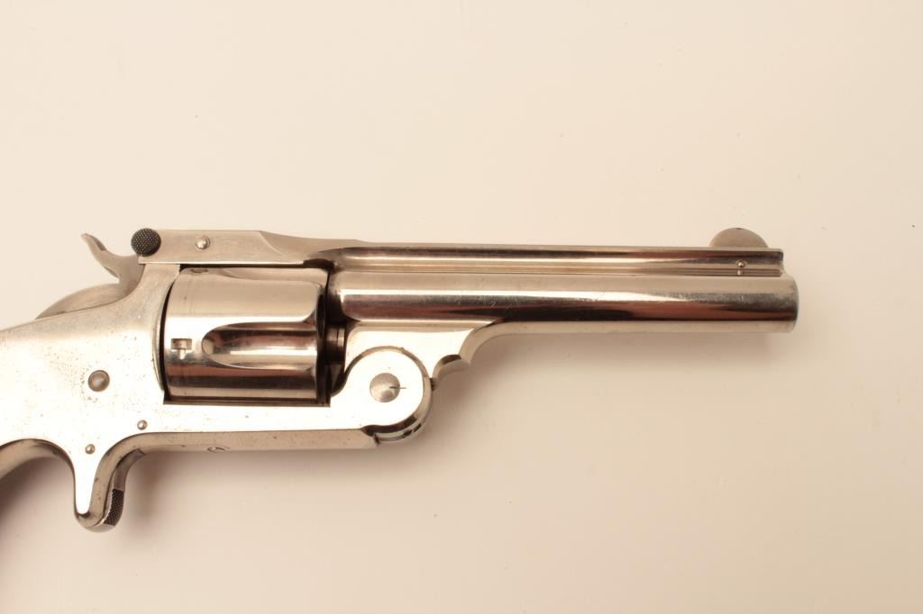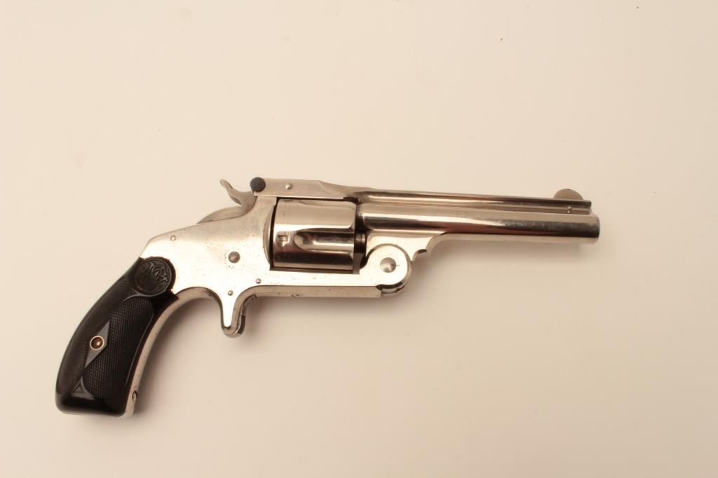 Smith & Wesson 38 Single Action Second model spur trigger revolver, .38 S&W caliber, 4” barrel, nickel finish, checkered hard rubber grips, S/N 79013; overall fine to excellent condition showing majority of originalfinish, fine bore, crisp action and markings, fine to excellent grips. (Antique). Est.: $350-$700.