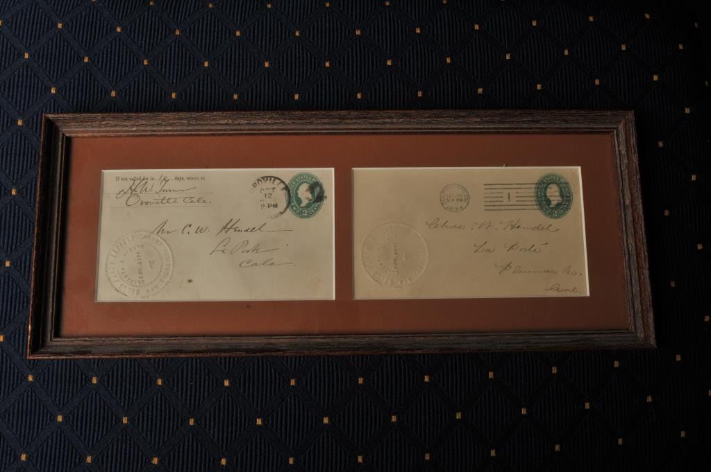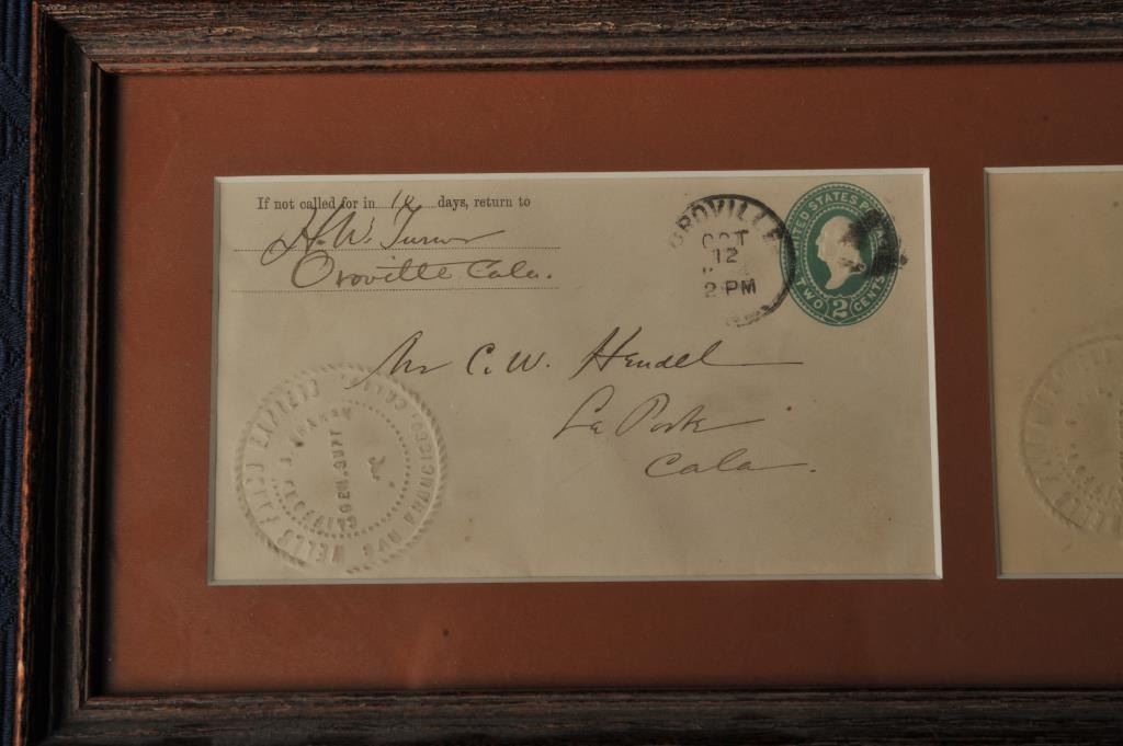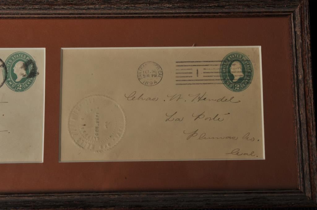 Framed and matted lot of 2 Wells Fargo Express-marked pre-1900 cancelled envelops. Est.: $50-$75.