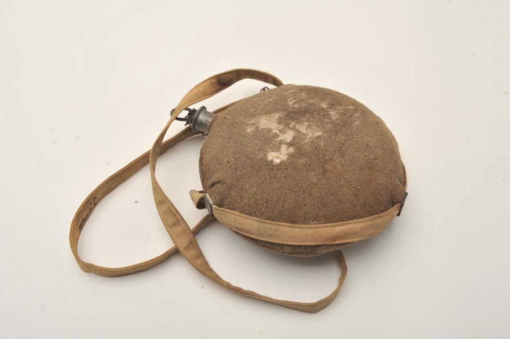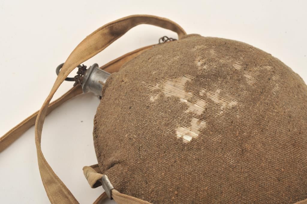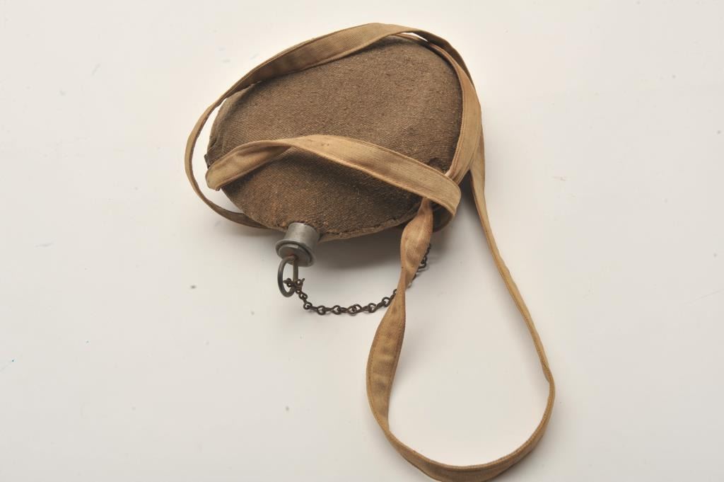 Civil War era “bullseye” circular tine canteen with fabric cover, tan linen shoulder strap and metal topped cork stopper secured to canteen by metal chain; canteen is approximately 8” in diameter, shows wear tofabric cover; marked on neck of spout “J.D. Johnson & Co./Feb. 6 __ ”(last 2 numbers indistinct). Est.: $250-$500.