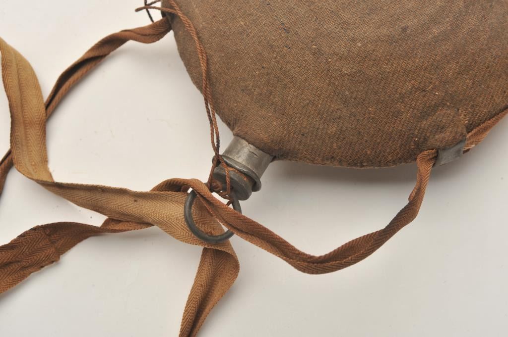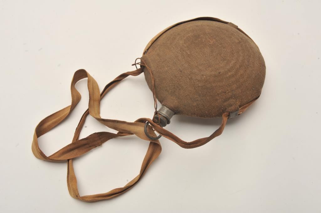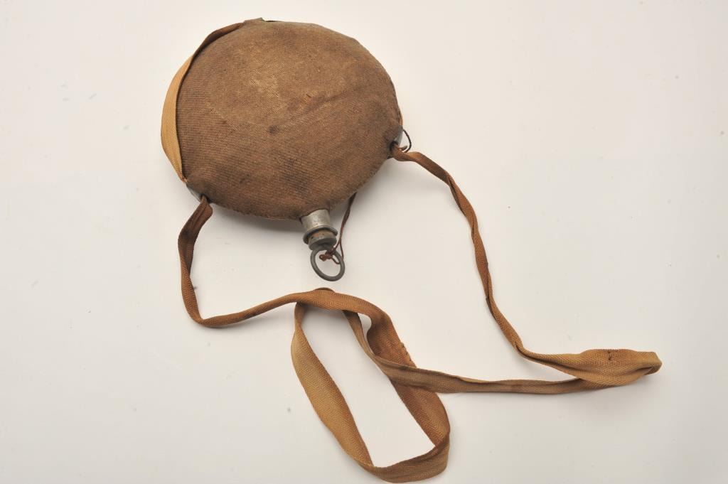 Civil War era “bullseye” circular tin canteen with fabric cover, tan linen shoulder strap and metal topped cork stopper secured to canteen by twisted twine; canteen is approximately 8” in diameter; some ware areas to cover but overall good with mostly complete stitching. Est.: $300-$600.