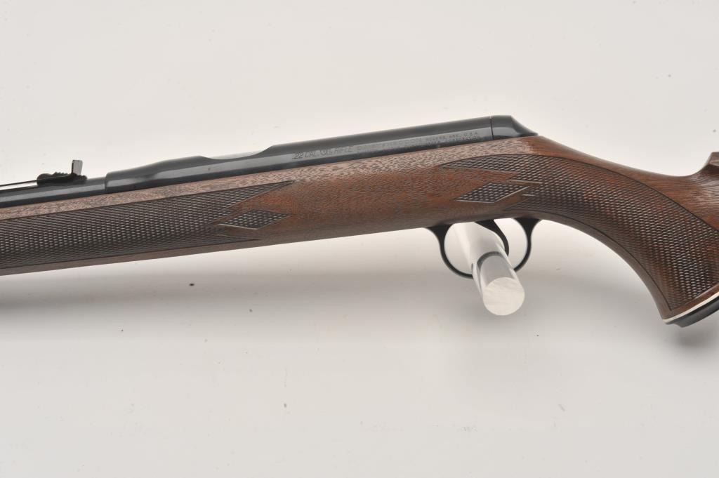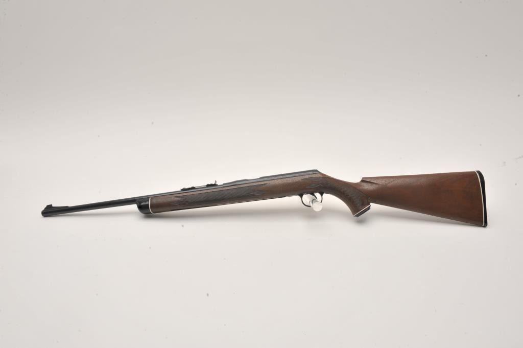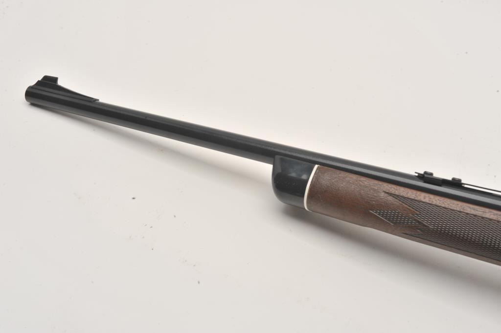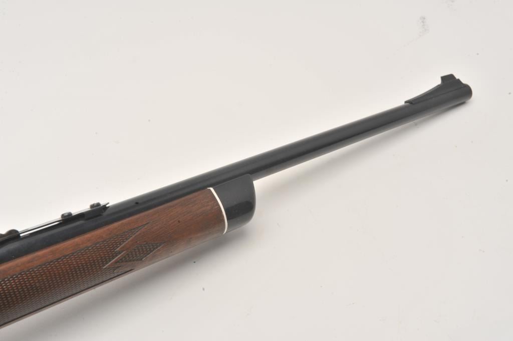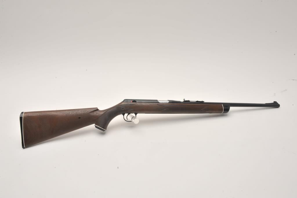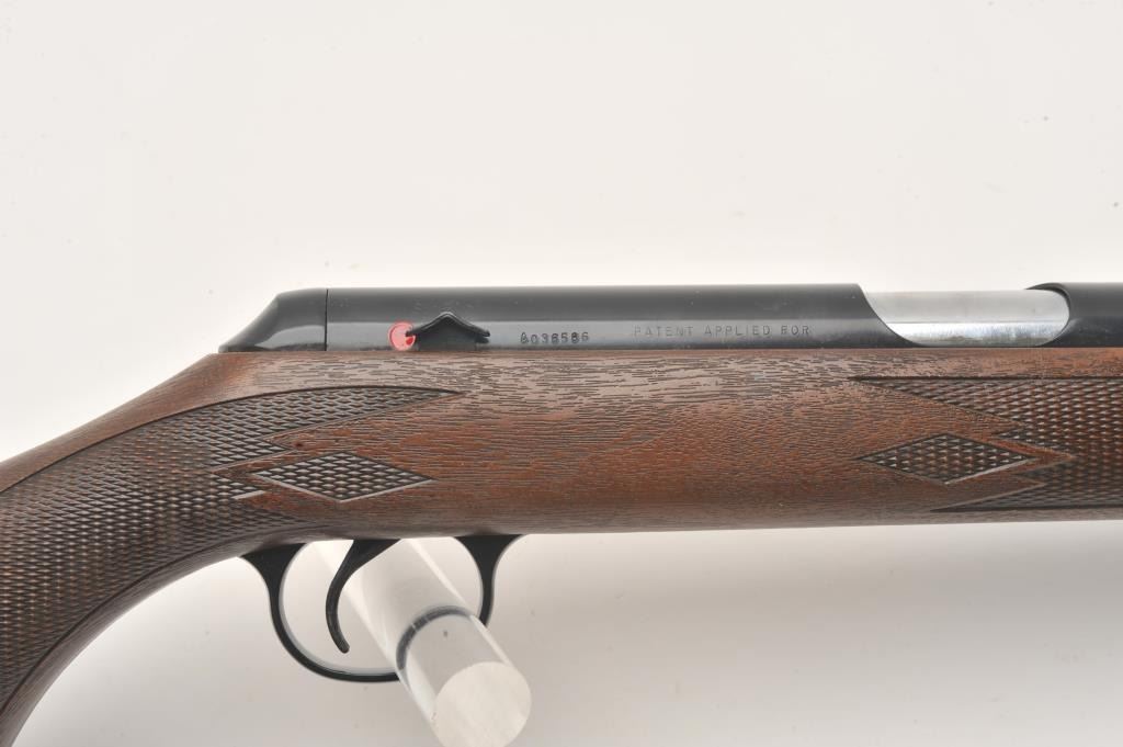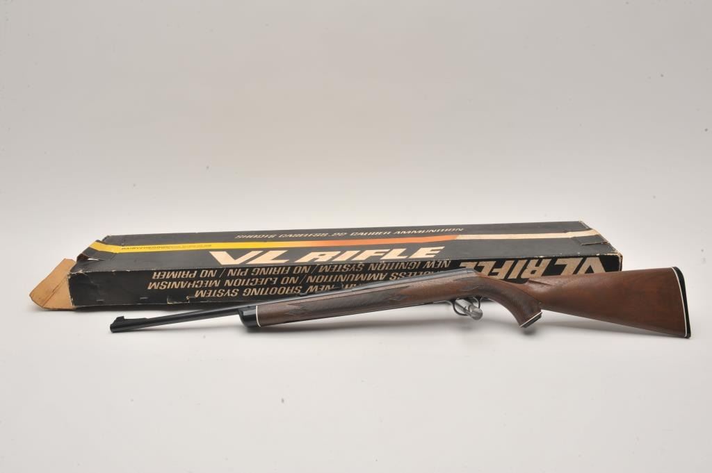 Daisy VL caseless cartridge rifle, #A036586, .22 caseless cal., 18" barrel, blued finish with plastic stock. Daisy produced a 22 caseless cartridge, designed in 1961, which was ignited by compressed air through a tinyhole in the back of the cartridge. The heat from the compressed air then ignited the propellant on the back of the bullet. In 1968, ATF put a stop to the manufacture of the rifles, as Daisy did not have the permits to manufacture firearms. Includes original box, in fair condition. (C&R) Est. $100-200