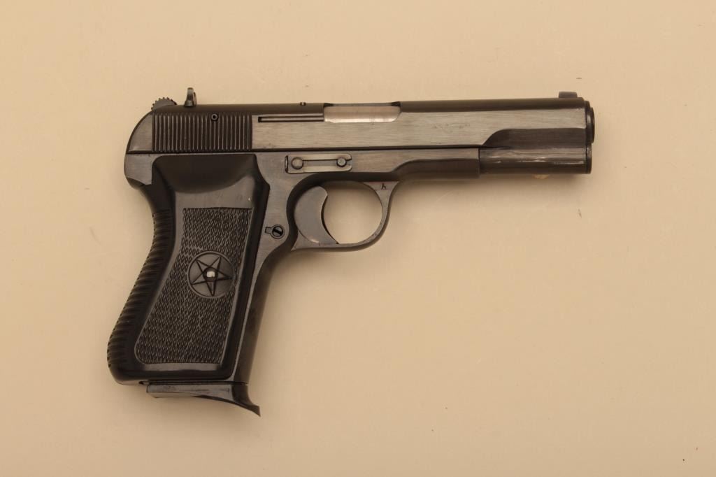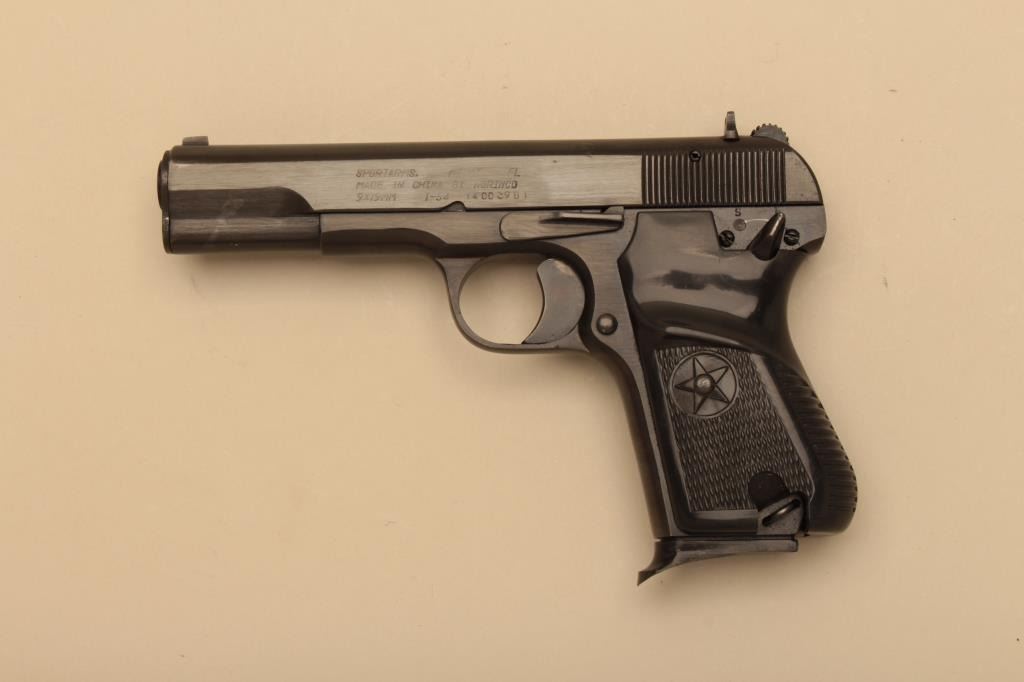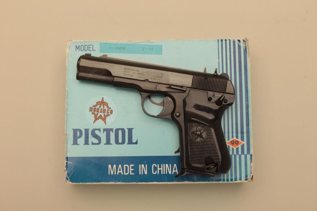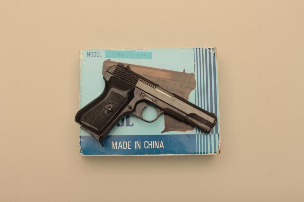 Tokarev Model 54T semi-automatic pistol by Norinco, 9mm caliber, Serial #14003981. The pistol is in very good overall condition with a 4 ¼” barrel. The metal surfaces retain the majority of the blue finish withprimarily handling marks. The slide is import marked. The checkered plastic grips are in good condition with small mars from carry and use. The bore is good, the action crisp and markings are legible. The pistolcomes with the factory cardboard sleeve, two magazines and a cleaning rod. Est.: $300-$600. (Modern).