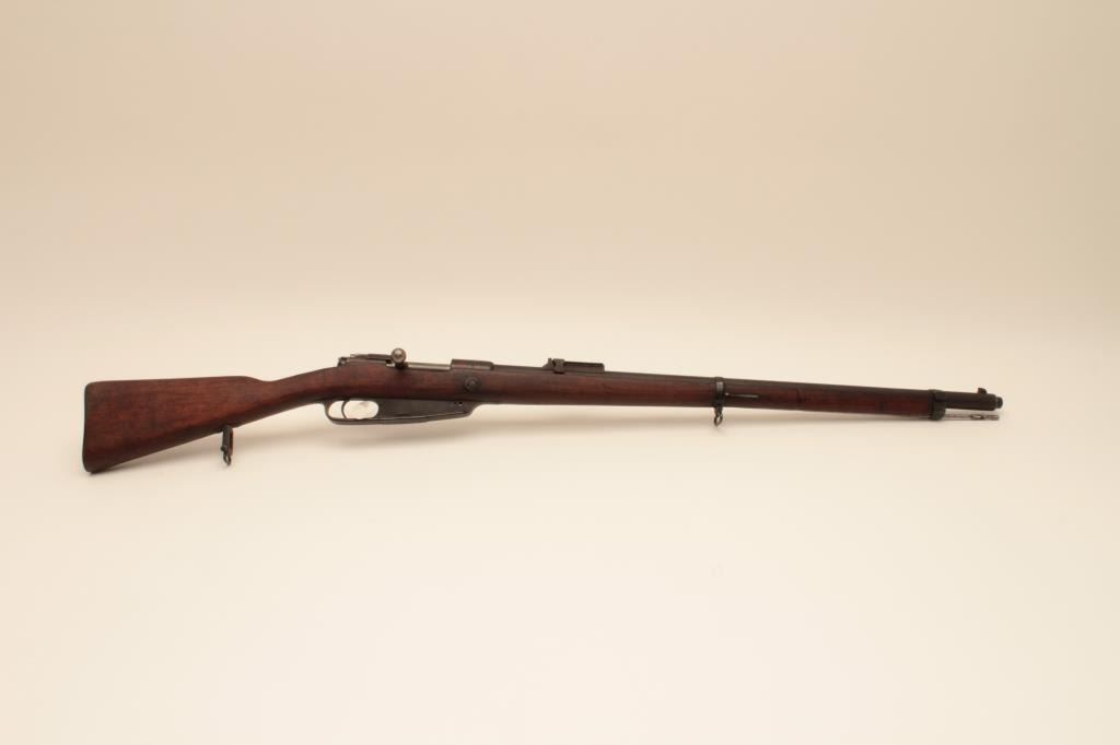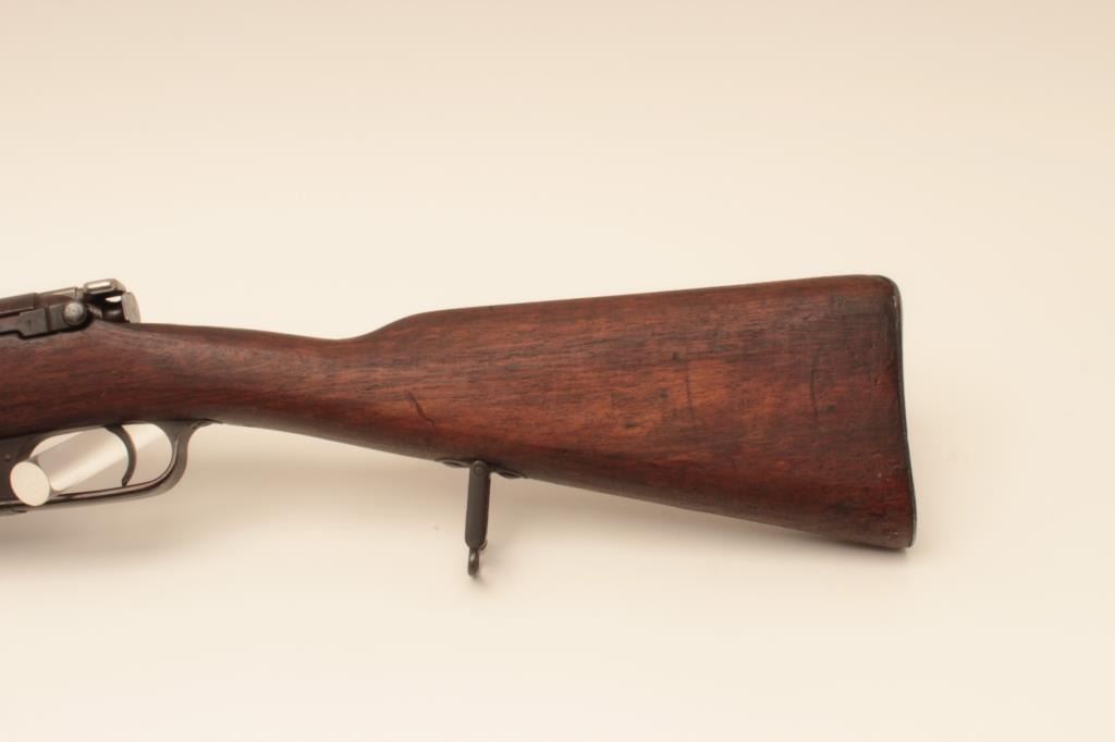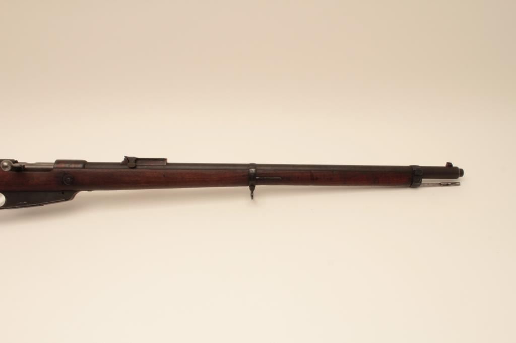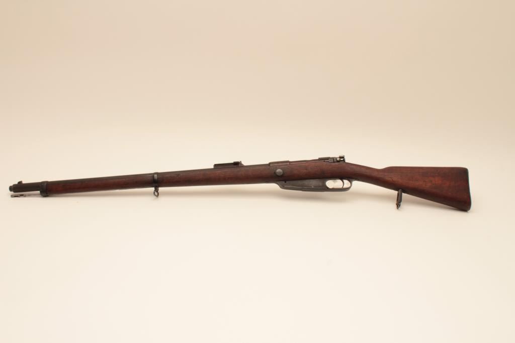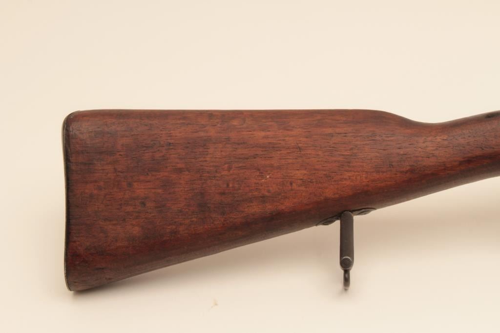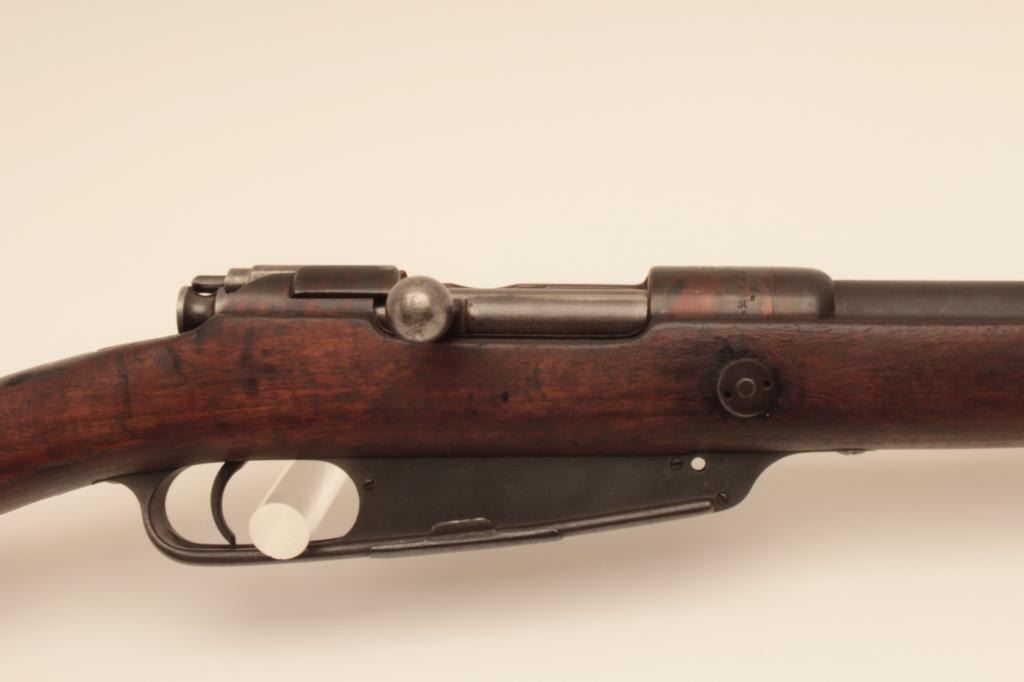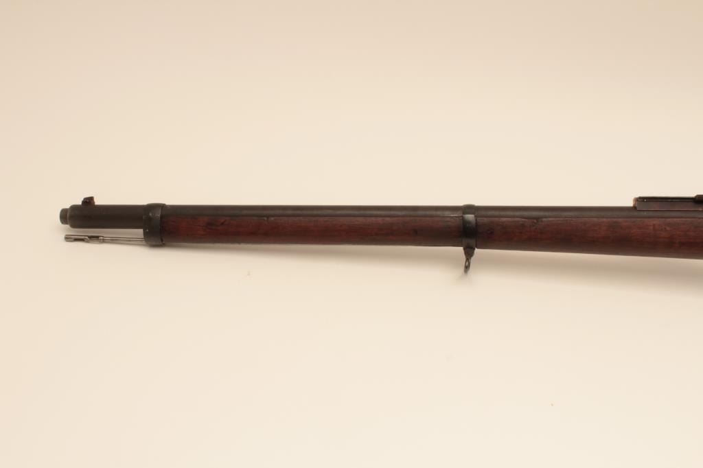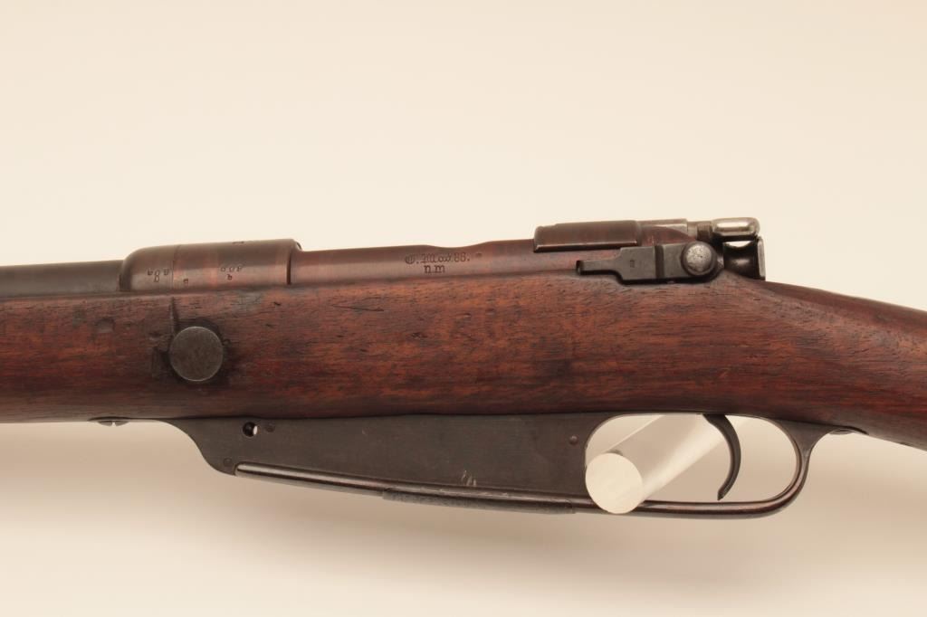 Mauser Model 88 bolt action rifle, 8mm caliber, Serial #609. The rifle is in good overall condition with 30” barrel with a ramped blade front and military tangent style rear sights. The barrel retains asignificant amount of its muted blue finish with the remainder going to a dark patina. The receiver has taken on a mottled brown/black patina with the front ring is marked Danzig with the Polish Crest and dated 1889. The smooth wood stock is in good condition with small mars and compressions and ends with a smooth steel butt plate. The bore is fair, the action is crisp and the markings are sharp. Est.: $200-$400.(Antique).
