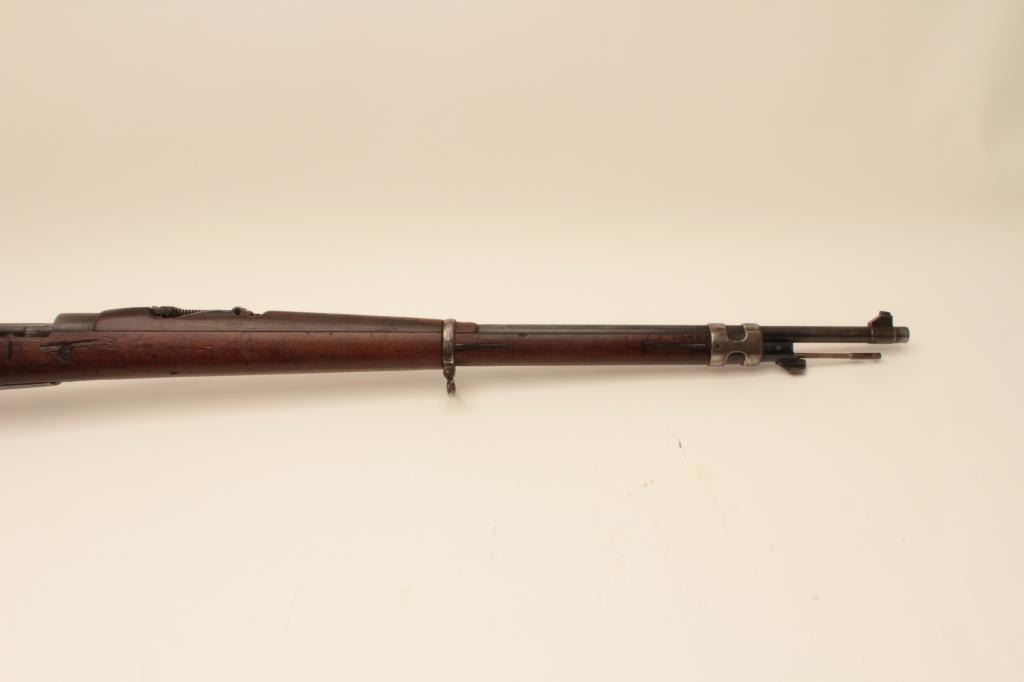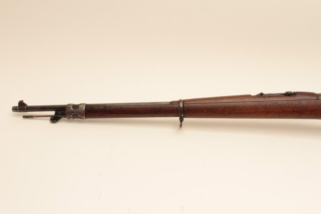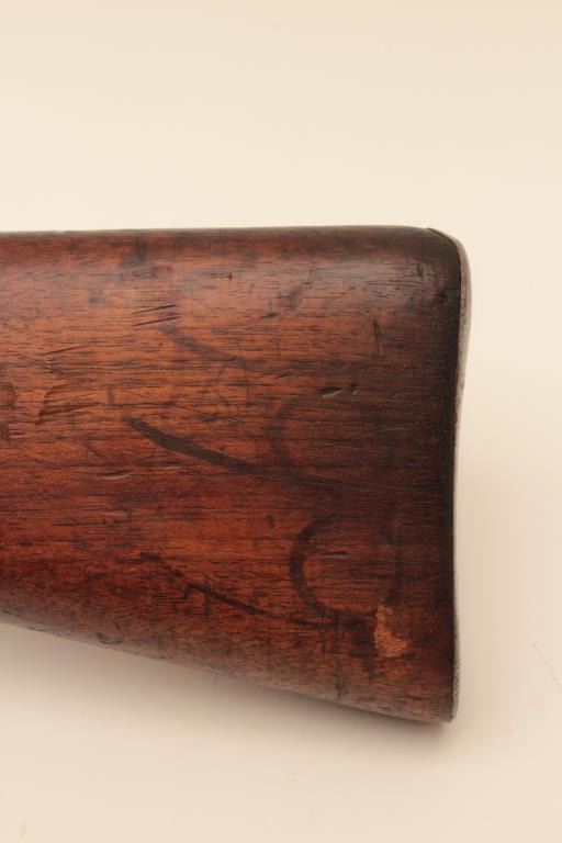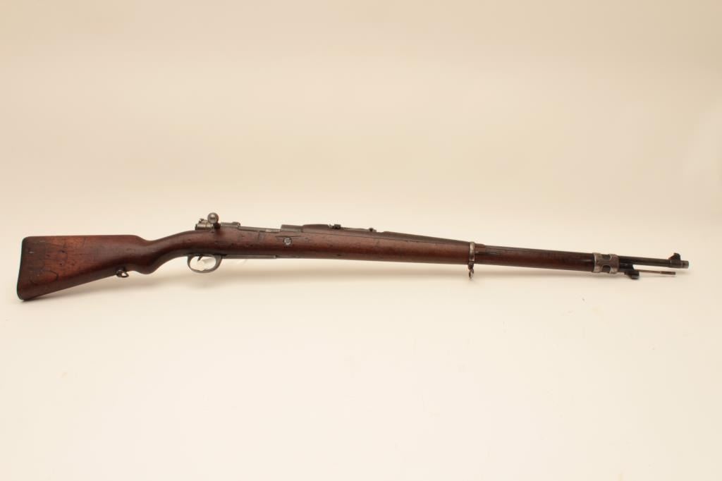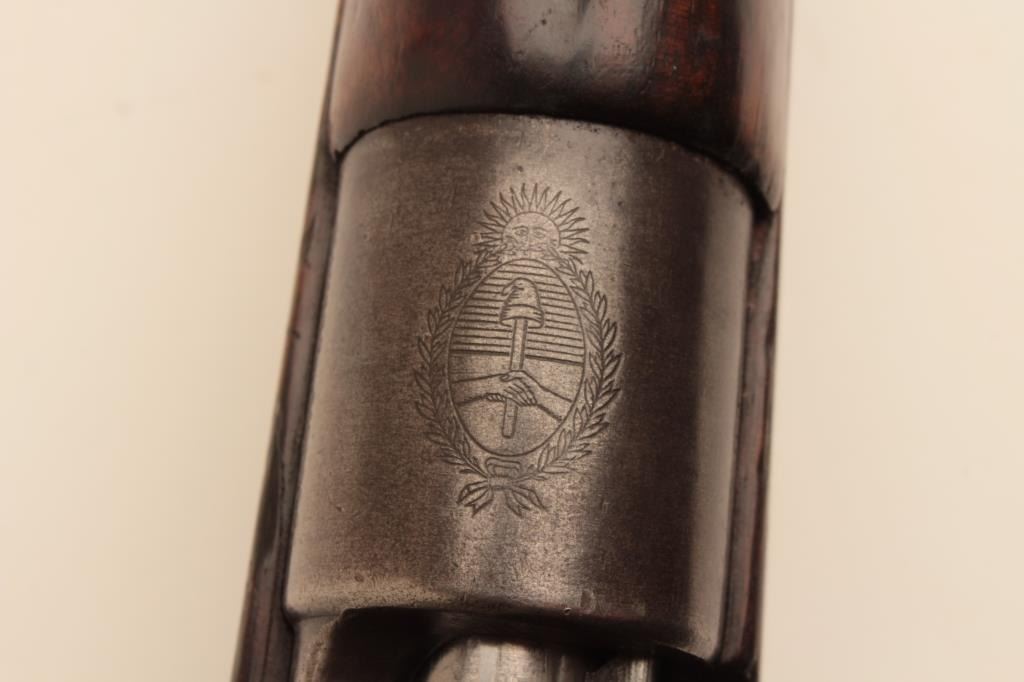 Argentine Model 1909 Mauser bolt action rifle, 7.65 caliber, Serial #A0154. The rifle is in good overall condition with a 30” import marked barrel with a ramped blade front sight and military tangent style rearsight. The metal surfaces retain a significant amount of their military finish with the Argentine crest on the front ring. The wood stock is in fair condition showing moderate wear with numerous dents and marsfrom carry and use. The number, “660” has been written on both sides of the butt stock, which ends with a smooth steel butt plate. The bore is fair, the action functions and the markings are legible. Est.: $250-$500. (C+R).
