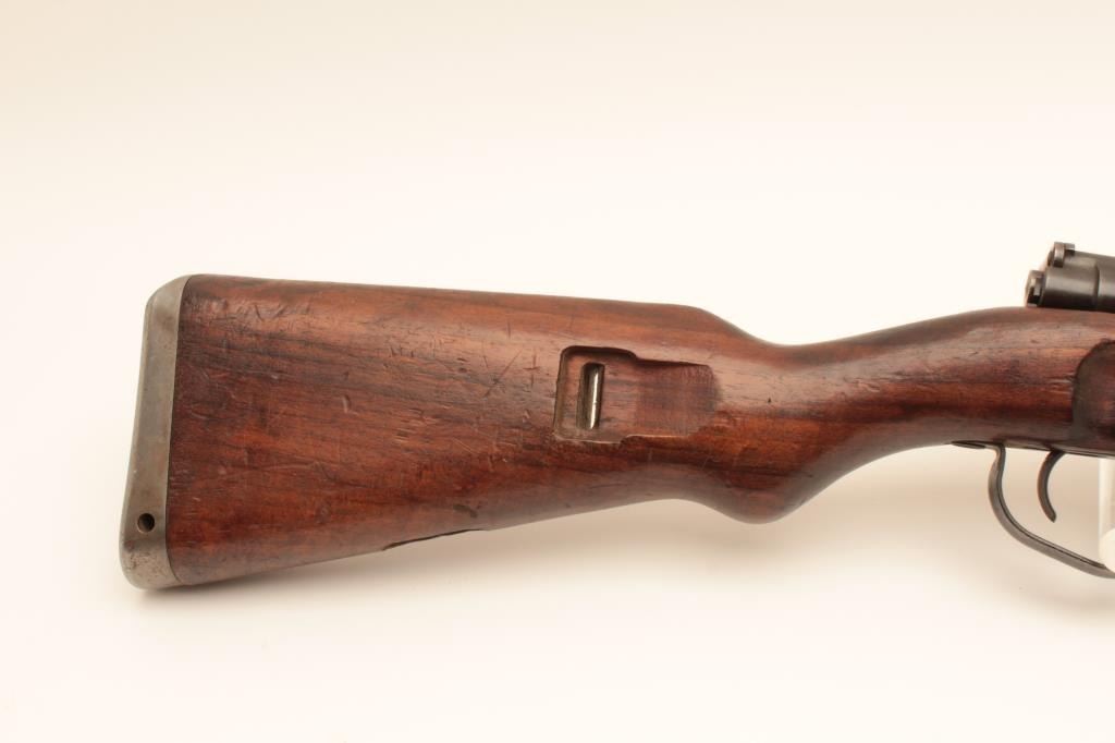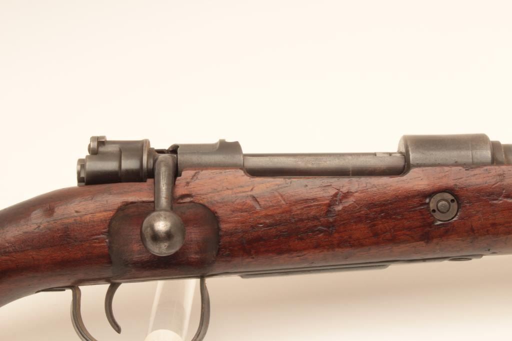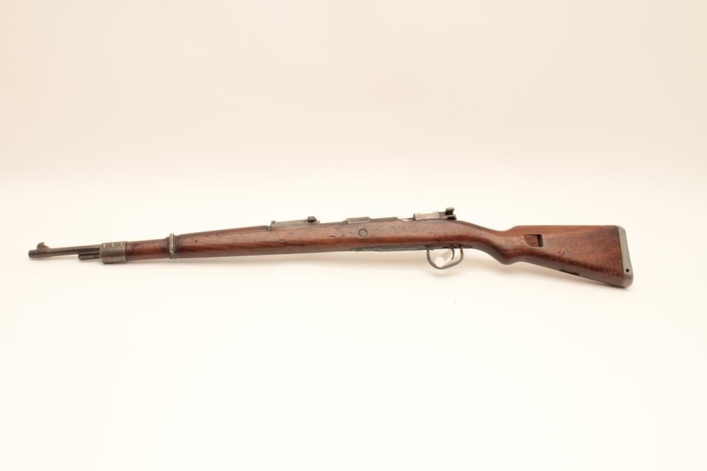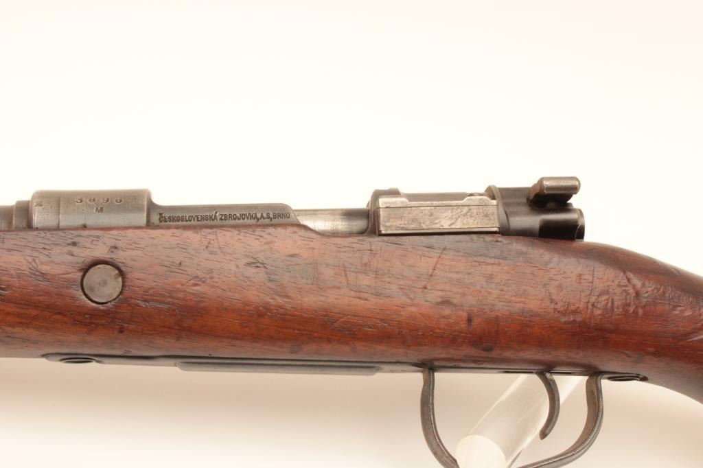 BRNO 98 Mauser bolt action rifle, 30/06 caliber, Serial #3896M. The rifle is in good overall with a 24” barrel with a ramped blade front and military tangent style rear sight. The metal surfaces retain asignificant amount of its military finish with, “EEE 30 06 JJ” all marked forward the front ring. The trigger guard has been replaced with the oversized winter style. The smooth wood stock is in good conditionwith mars and compressions consistent with service use. The butt ends with a smooth steel butt plate. The bore is fair, the action functions and the markings are legible. Est.: $300-$600. (C+R).
