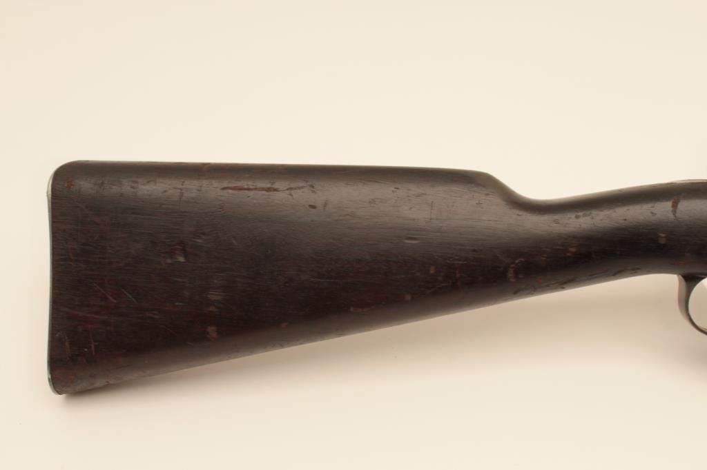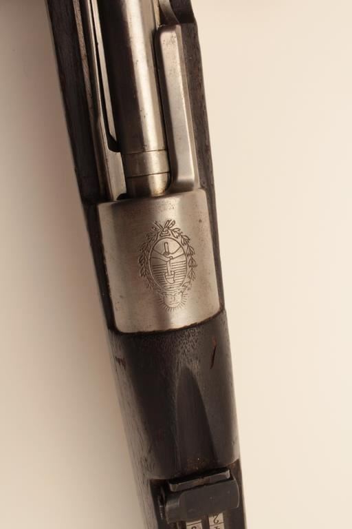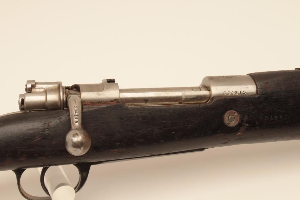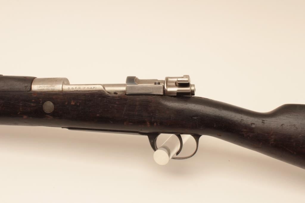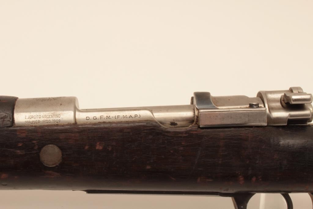 Argentine Model 1909 Mauser bolt action rifle, 7.65 caliber, Serial #004315. The rifle is in good overall condition with a 23” barrel with a protected blade front sight and military tangent style rear sight. Themetal surfaces retain a significant amount of their military finish with the action and the bent bolt in the white. The front ring features the Argentine crest and all visible serial numbers are matching. The Mannlicherstyle wood stock is in fair condition showing moderate wear with dents, gouges and areas of finish loss. The butt stock ends with a smooth steel butt plate. The bore is fair, the action functions and the markings arelegible. Est.: $150-$300. (C+R).
