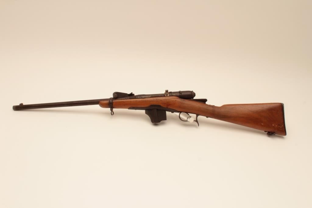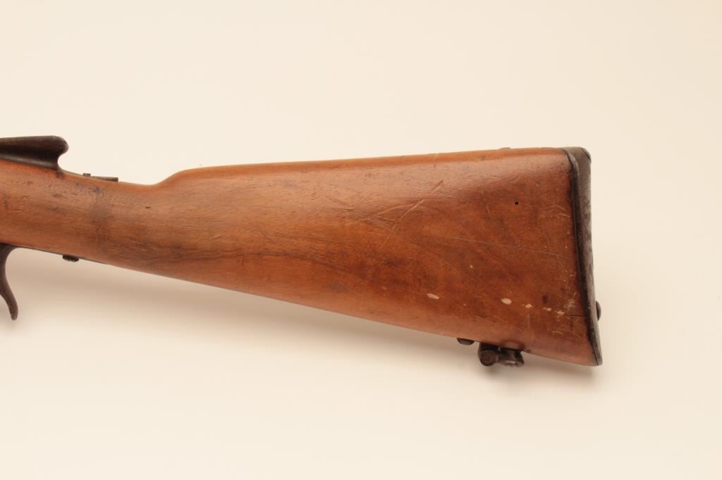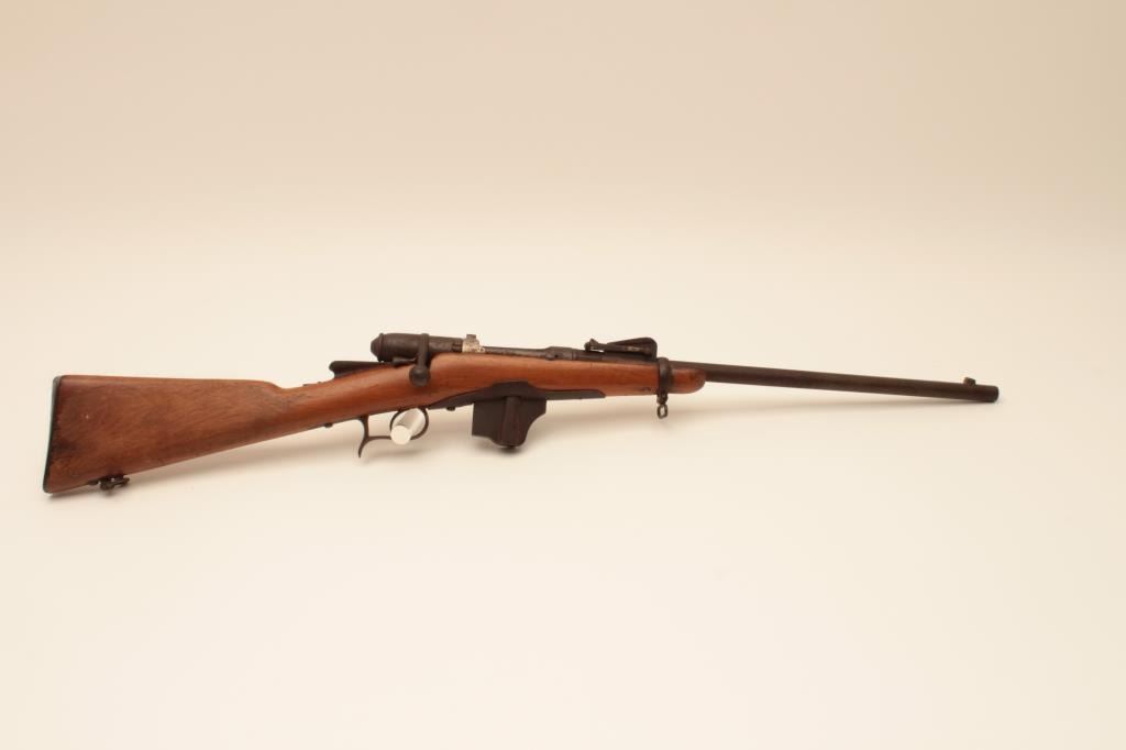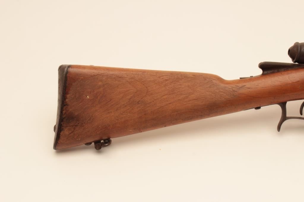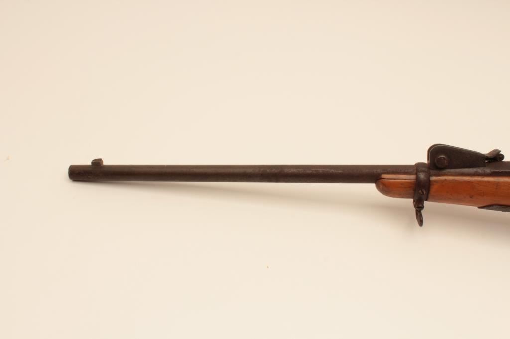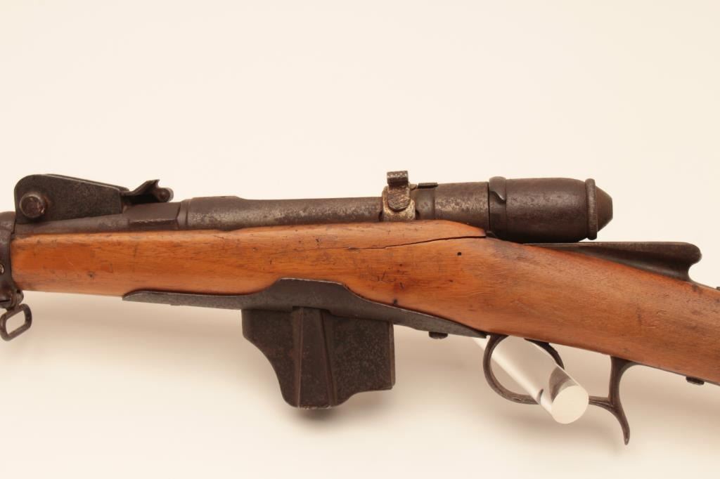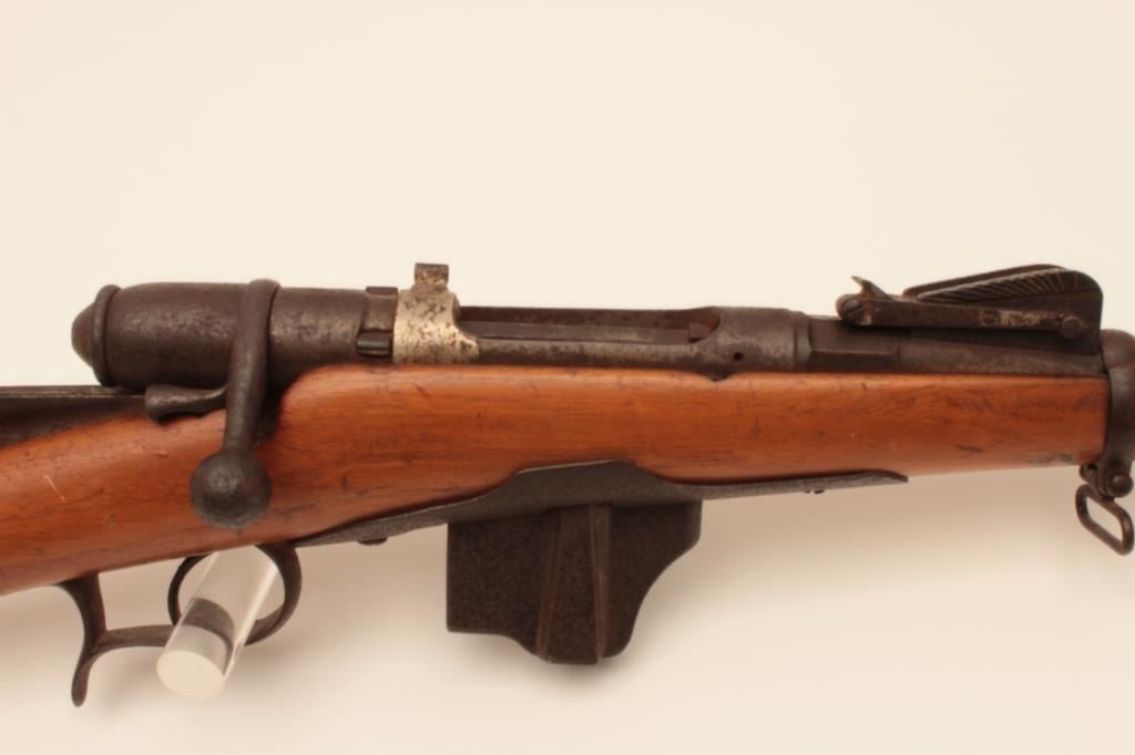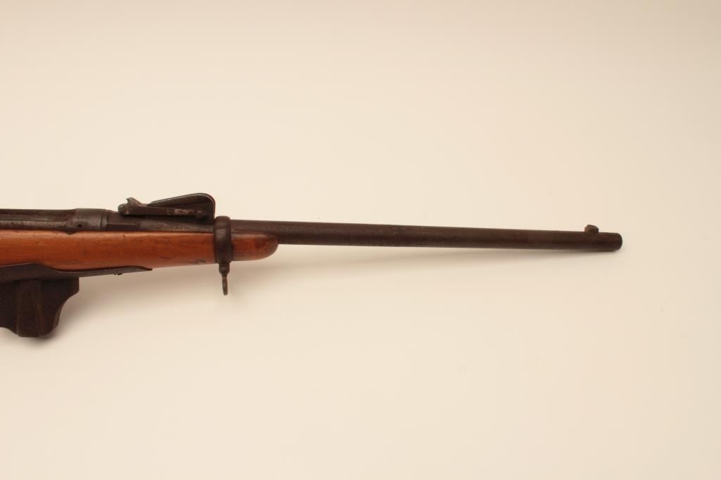 Swiss Vetterli bolt action carbine, approximately 10.4 mm, Serial #NSNV. The carbine is in poor condition with an 18” barrel. The metal surfaces show light to moderate surface rust and the action isinoperable at the time of description. The smooth wood stock is in fair condition with a 4” lateral crack on the left side of the action. Est.: $100-$200. (Antique).