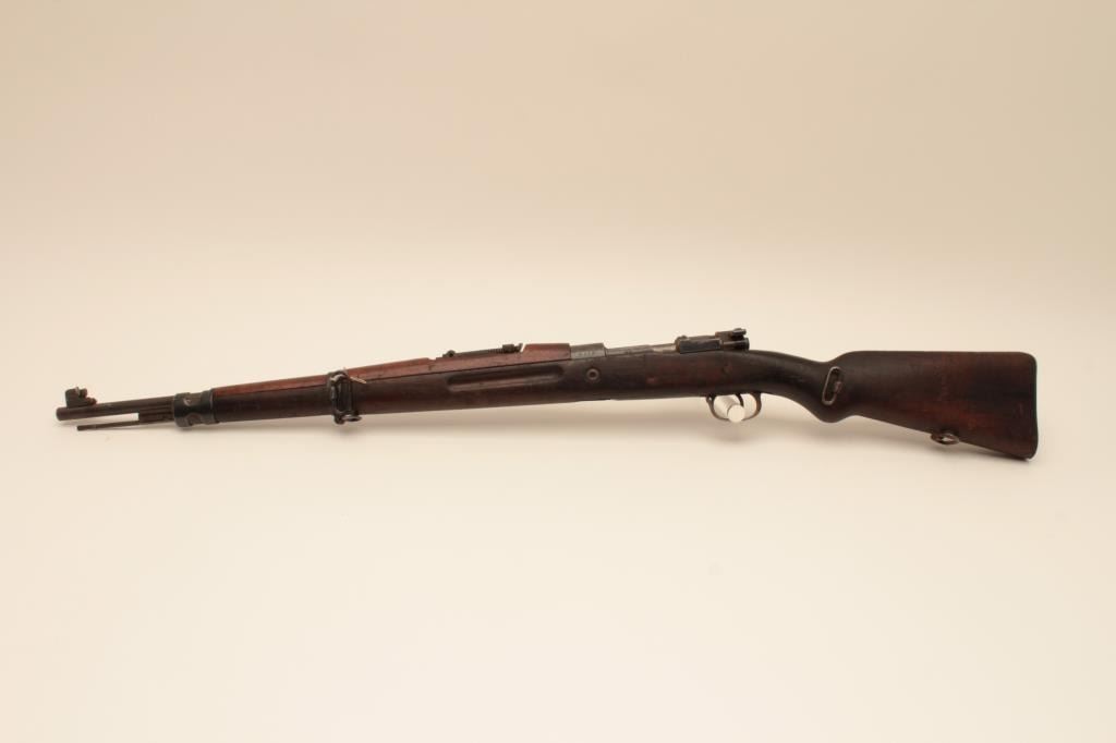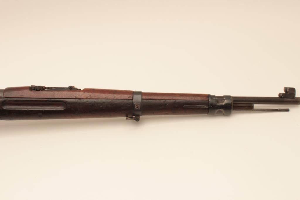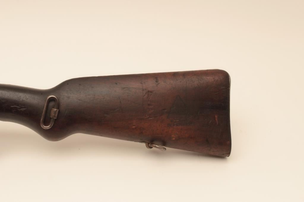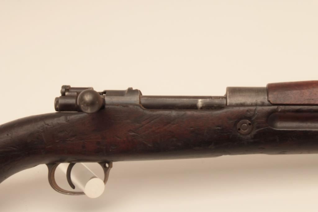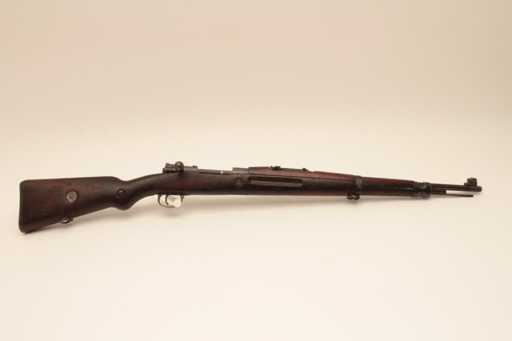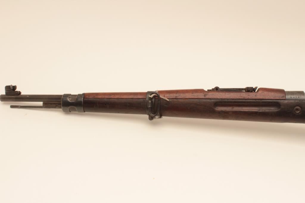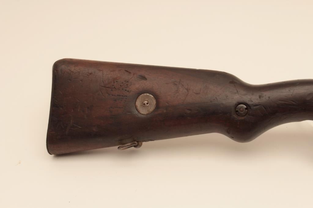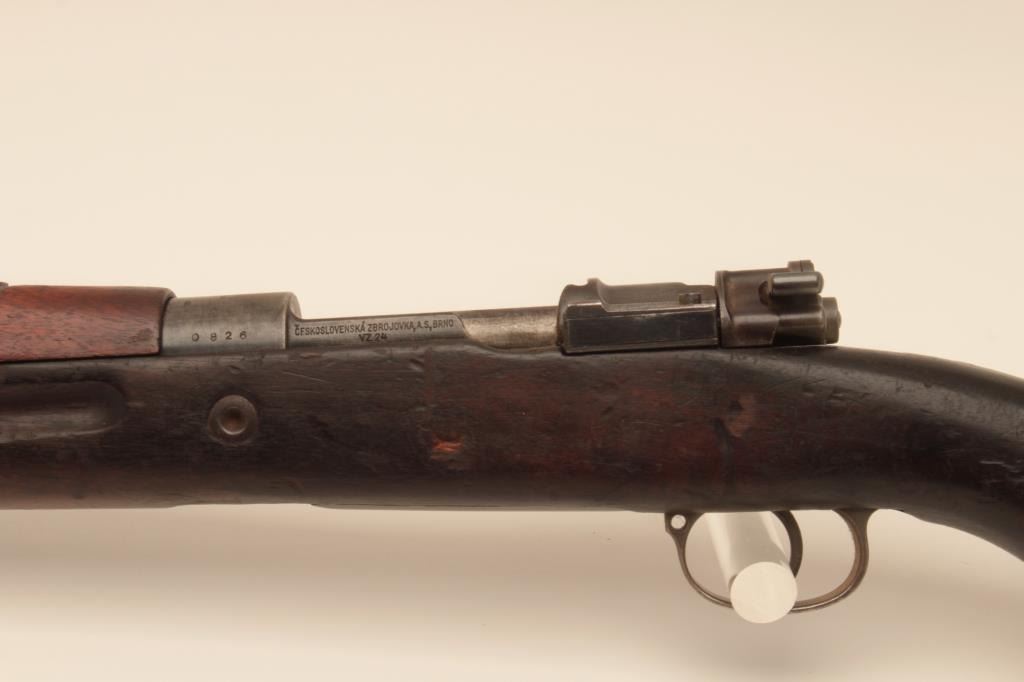 BRNO VZ24 bolt action rifle, 8mm caliber, Serial #0826. The rifle is in good overall with a 24” barrel with a protected blade front and military tangent style rear sight. The metal surfaces retain a significantamount of its military finish. The smooth wood stock is in fair condition showing heavy wear and use with the initials, “SFCH” punched into the right side of the butt stock. The butt ends with a smooth steelbutt plate and a steel disc has been added to the right side. The bore is fair, the action functions and the markings are legible. Est.: $150-$300. (C+R).