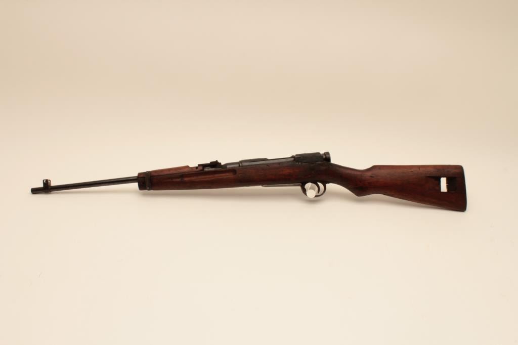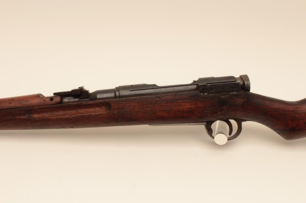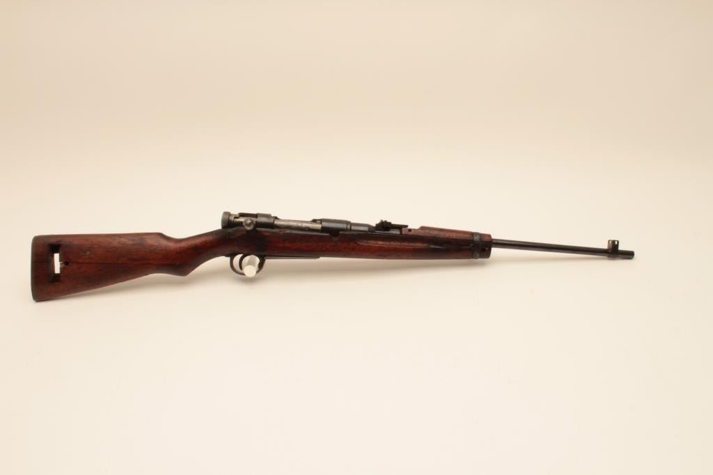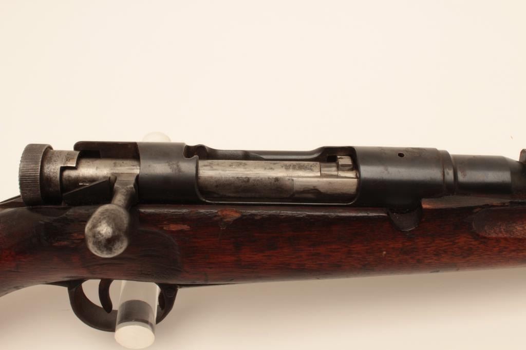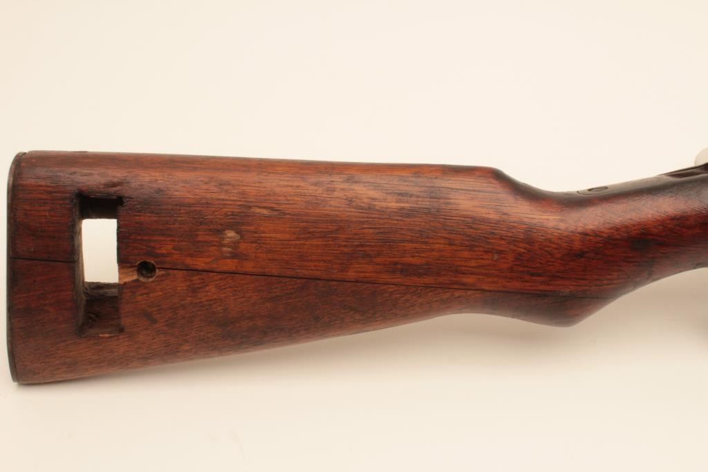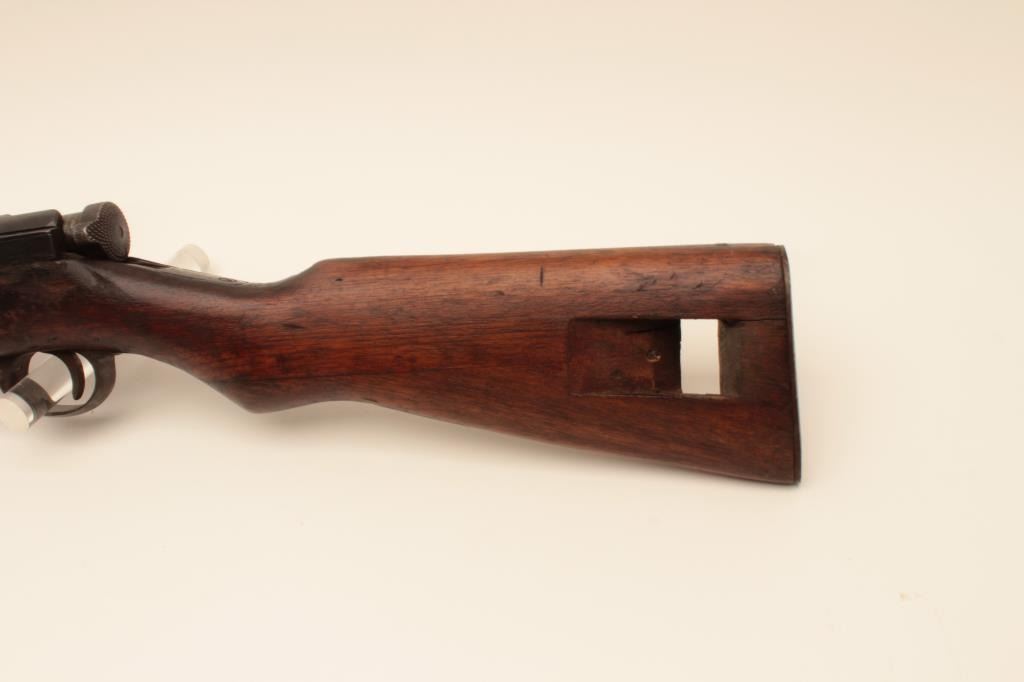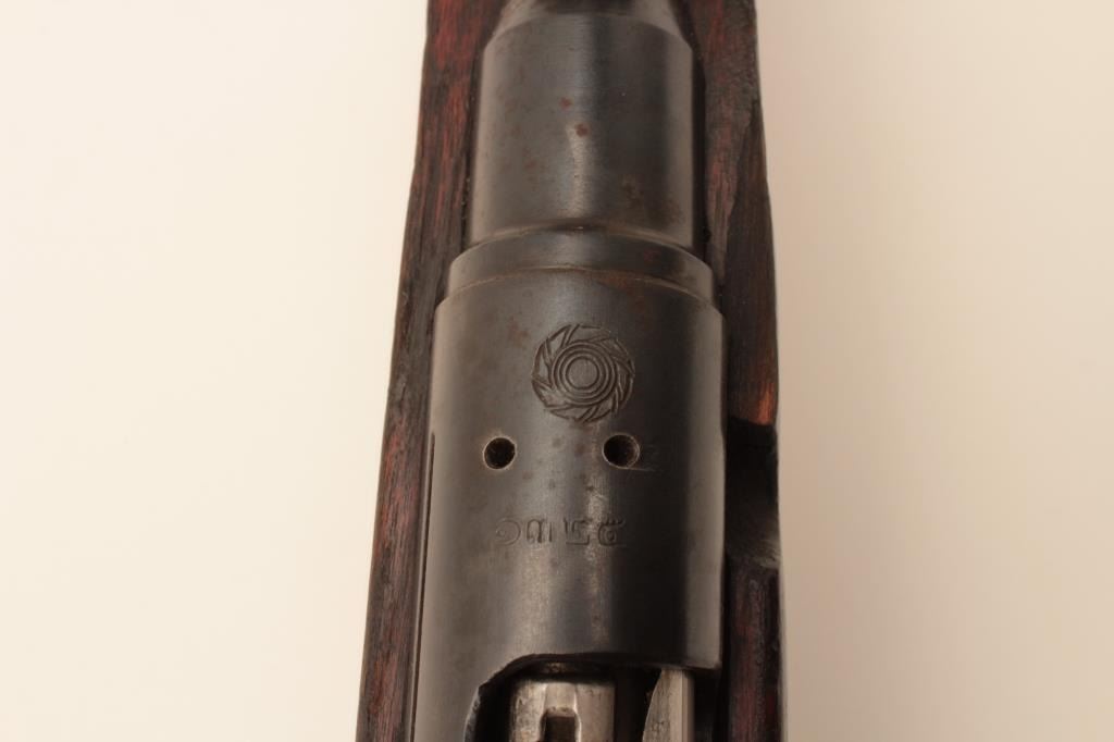 Siamese Arisaka Model 38 bolt action rifle, 6.5 caliber, Serial #NSNV. The rifle is in fair overall condition with a 20” barrel having seen considerable use. The metal surfaces retain the majority of their bluefinish with some light surface rust on the action. The front ring features the Siamese crest. The smooth wood stock is a period replacement which resembles an old M1 carbine stock. The stock is in fair conditionshowing heavy wear with a lateral crack in the butt stock. The bore is fair, the action functions and the markings are legible. Est.: $200-$400. (C+R).