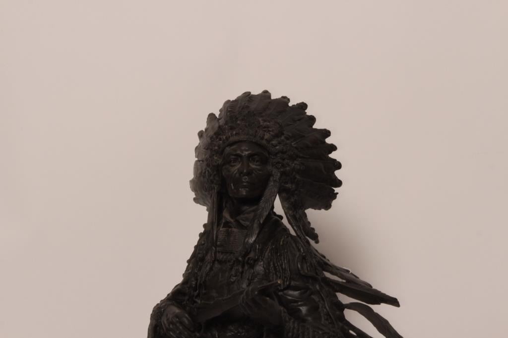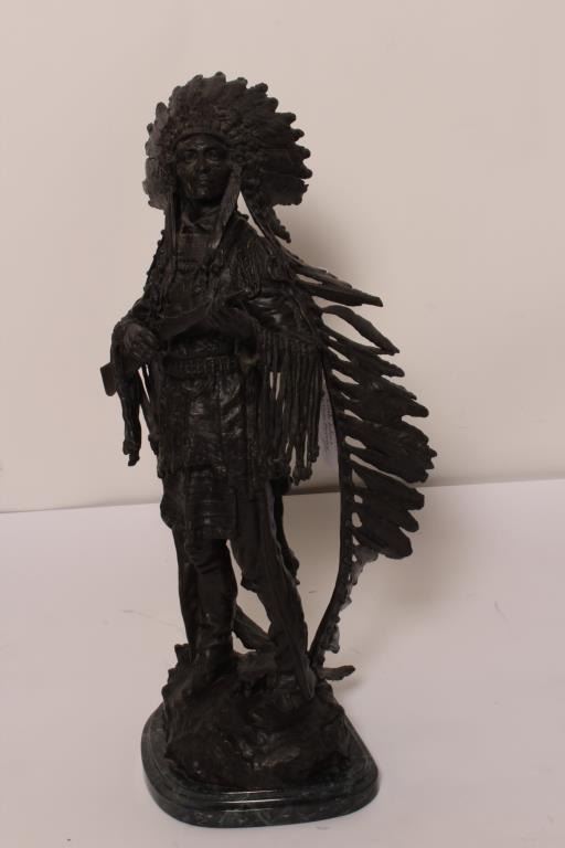 Large bronze of Indian Chief with Trapdoor Carbine, c. Kauba; approximately 26” x 10” x 8”; nice patina and detail. Est.: $200-$400.