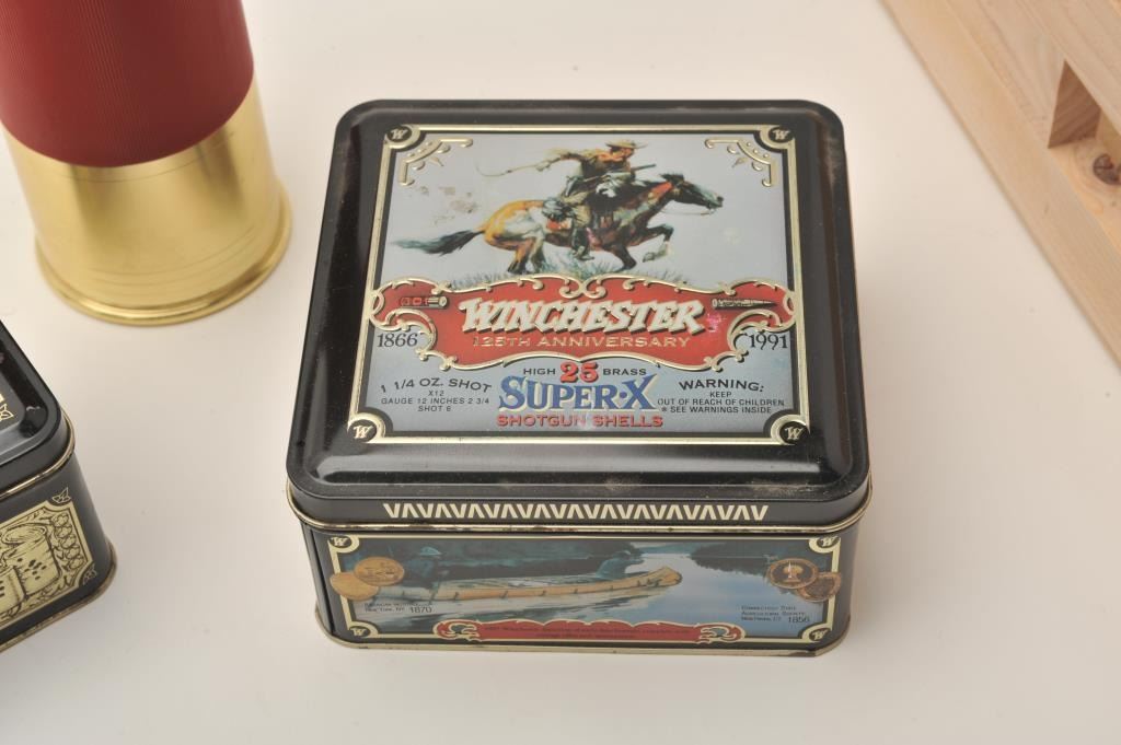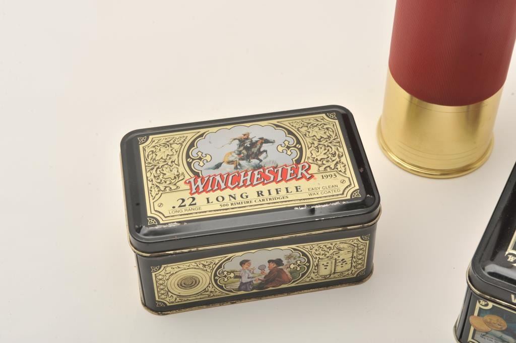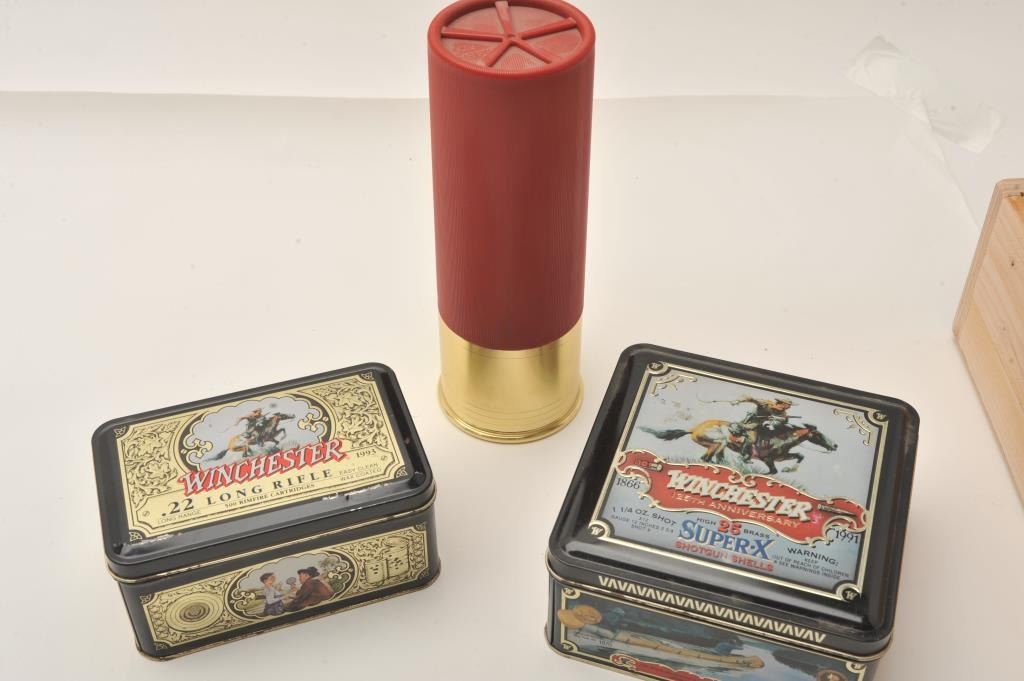 Lot of shotgun shell shaped cigar humidor and two Winchester commemorative tins. The shotgun shell humidor is approximately 9” tall with a screw-on brass base and is lined with Spanish cedar to enhance flavor. TheWinchester tins contain 500 .22 Long Rifle and 25 12 gauge shells respectively. Both tins are in good overall condition with small dents and scrapes. Est.: