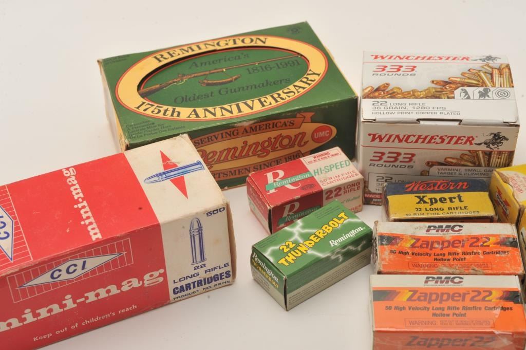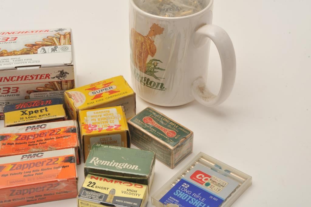 Lot of collectible rimfire ammunition, Remington commemorative mug, tin and a Colt .22 Long Rifle cylinder for a SAA. The lot includes over 1,500 rounds of .22 rimfire ammunition by CCI, PMC, Remington andWinchester among others. Additionally, the lot includes a 1993 Remington commemorative coffee mug filled with .22 rounds and a Remington 175th anniversary tin still in the factory box. The Colt cylinder shows a small amount of light surface rust at one end but is otherwise new in the box. Est.: