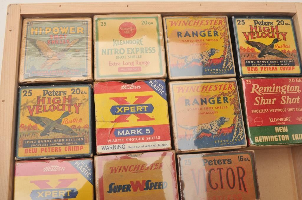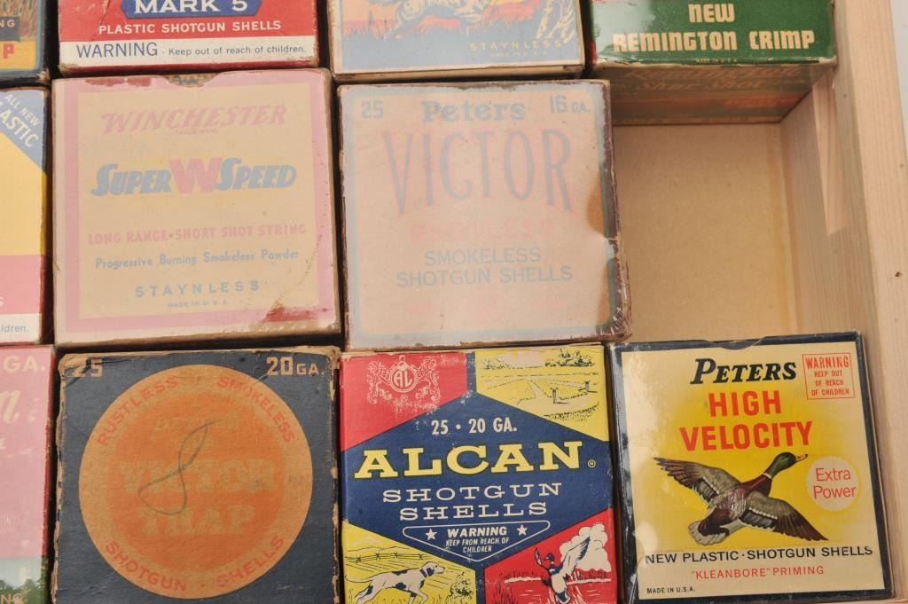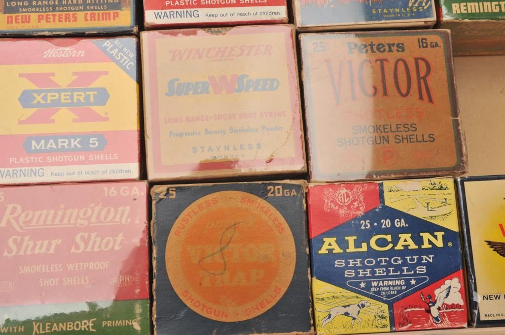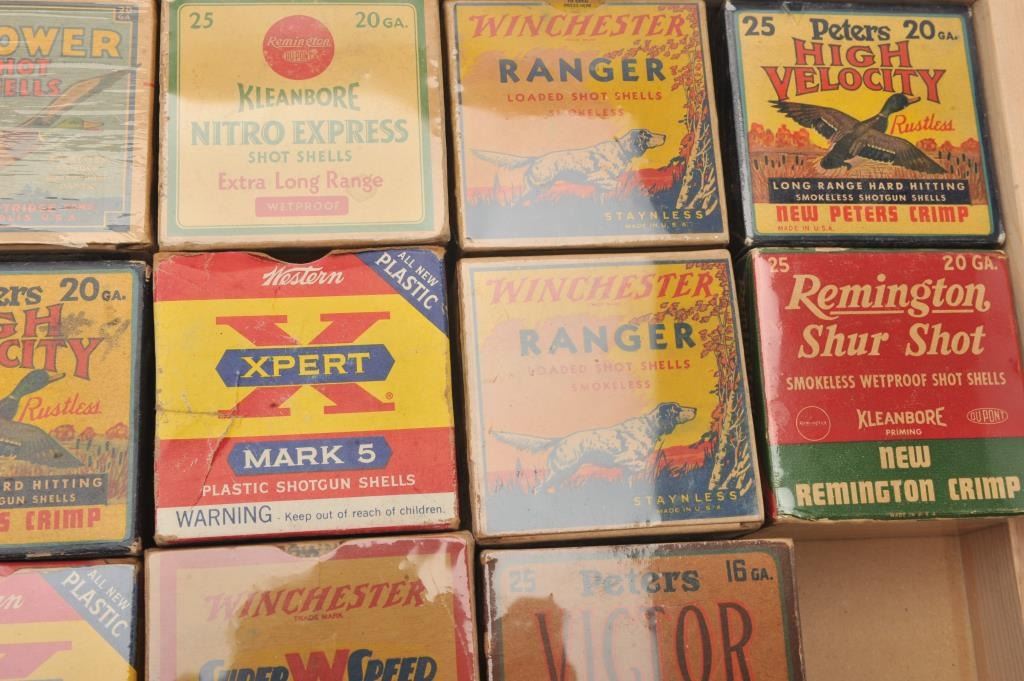 Bonanza lot of collectible 20 gauge shotshell boxes. Eleven boxes are empty with four full boxes by Alcan, Peters, Remington and Winchester among others. Most boxes are in at least good condition with sharp labels.Est.: