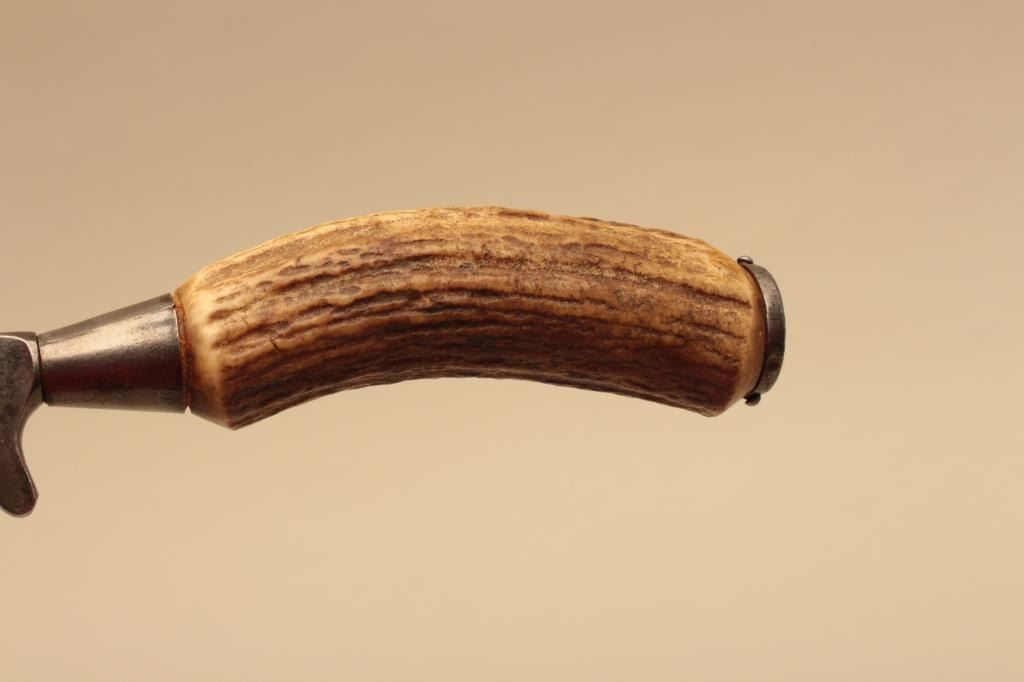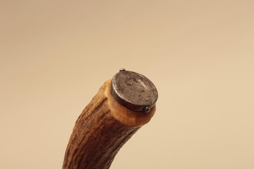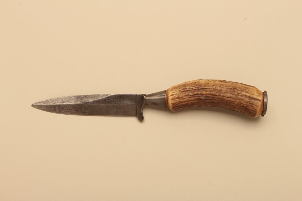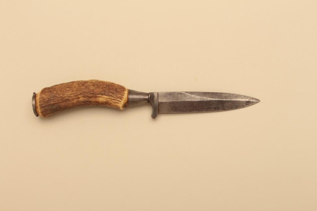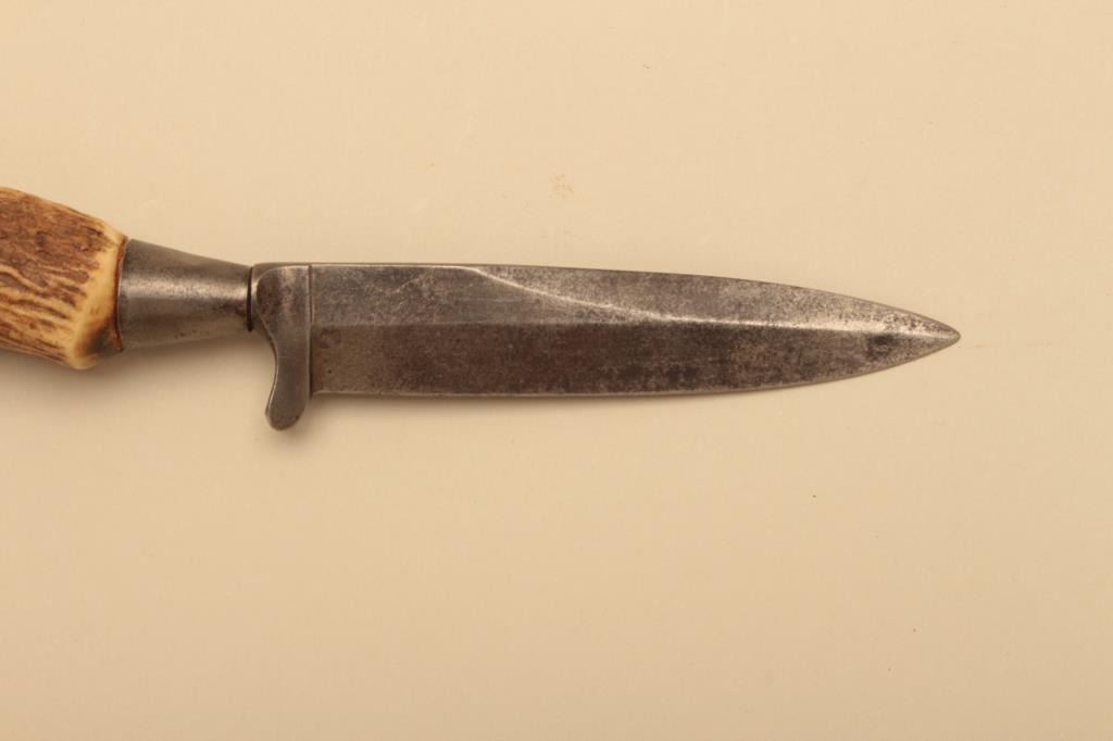 German knife with stag grip and piercing blade marked “Brunmer DRGM” and the rest not legible. Brought from Germany with Luftwaffe helmet by same vet as lot 1154. Measures 10” overall with a 5” blade. Fair to goodcondition. Est.: $35-$70
