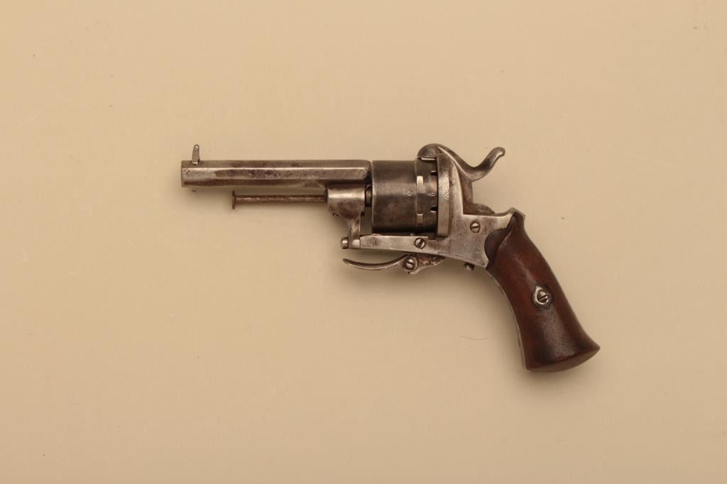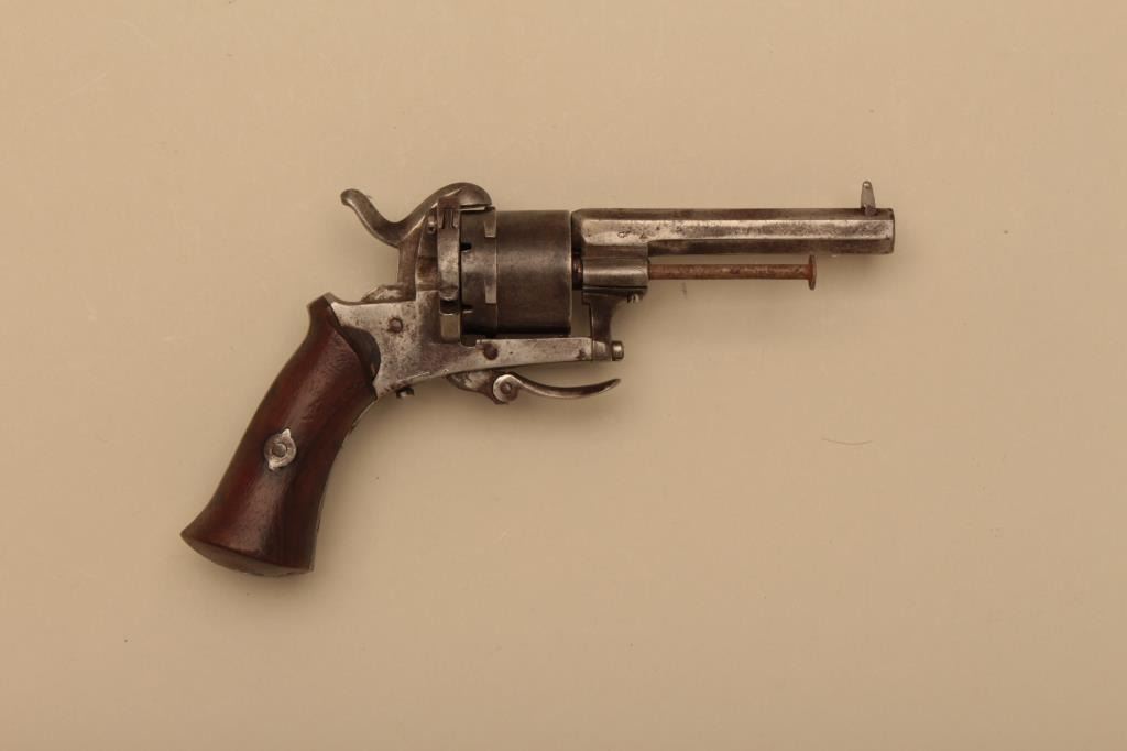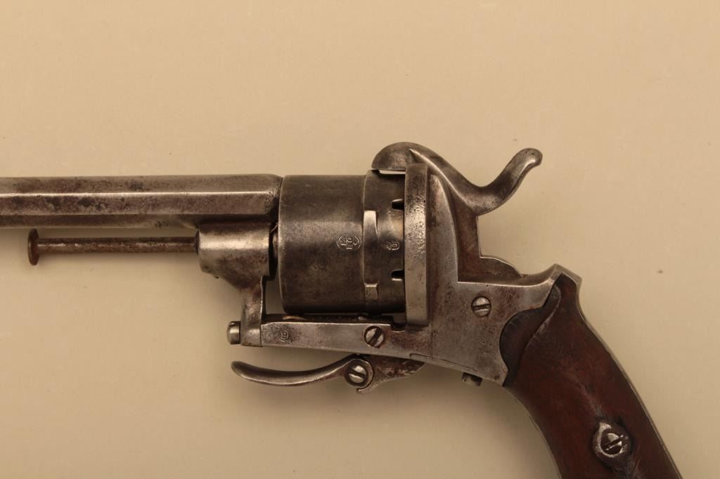 Antique Belgian pinfire 7.5mm revolver in good condition. No maker’s markings. Working but trigger is sticking and not returning. The grips are very good. About Civil War era. Measures 7 ½” overall with a 3 ¼” barrel.(Antique) Est.: $90-$180