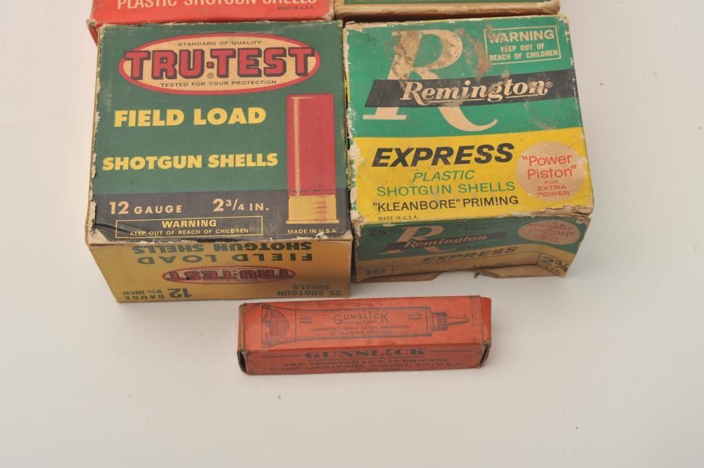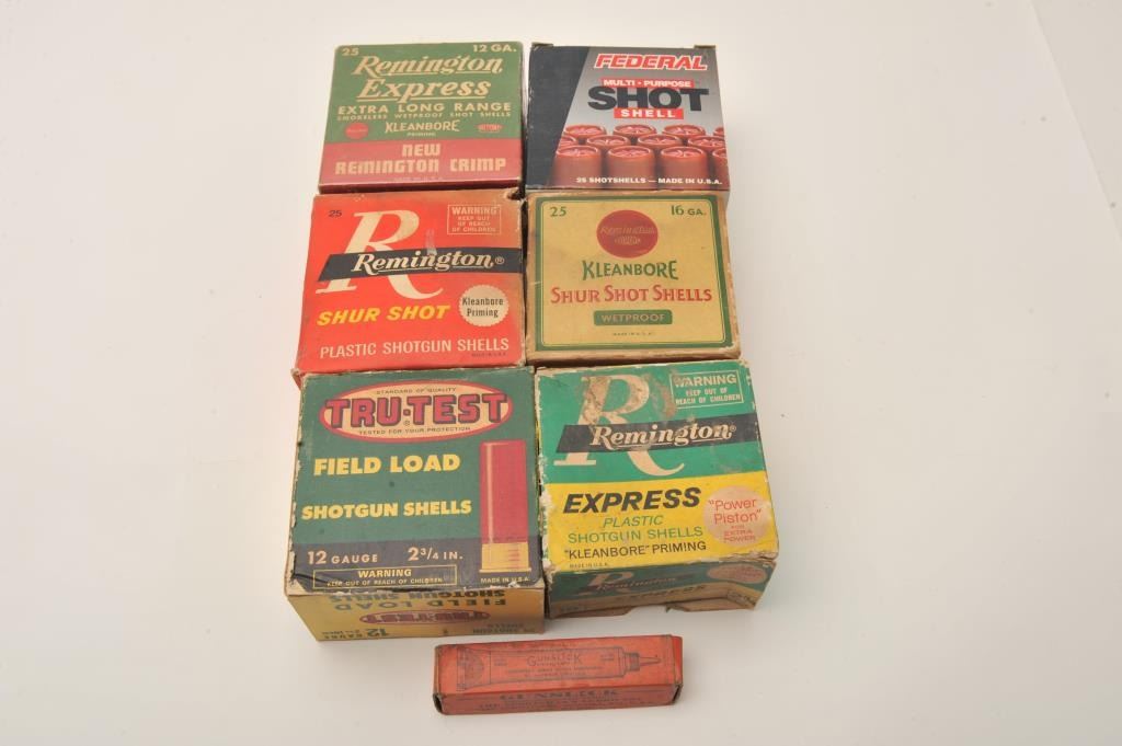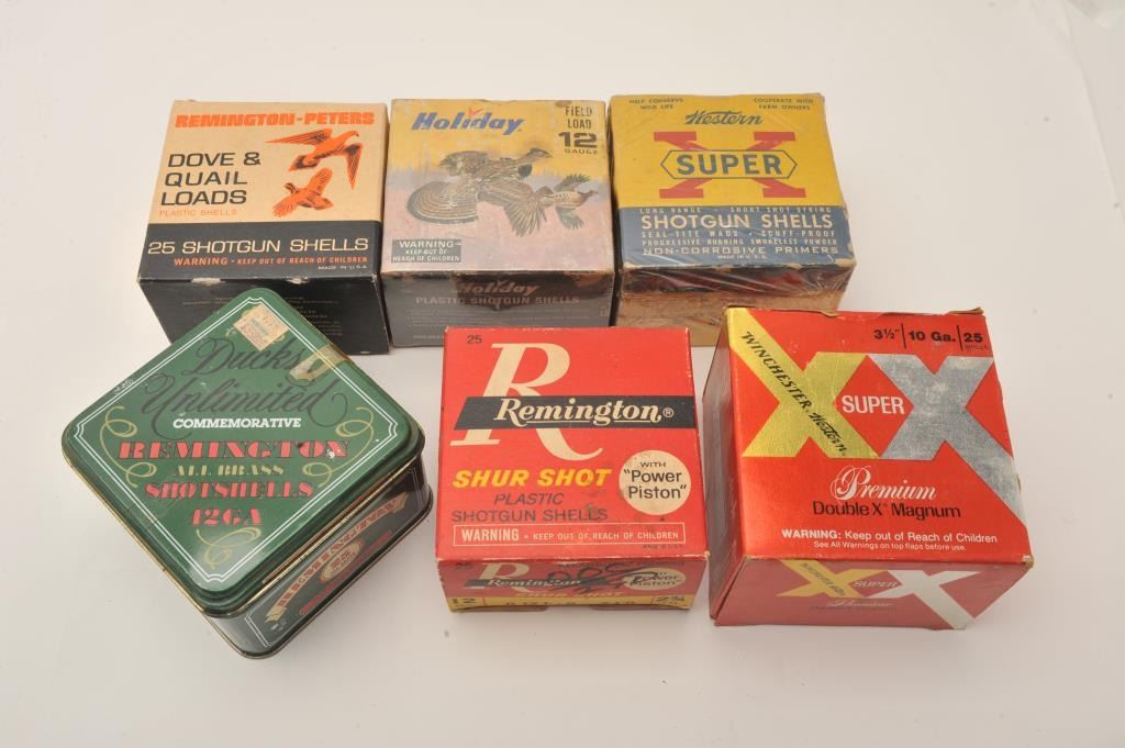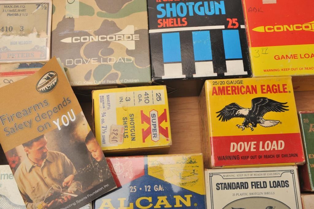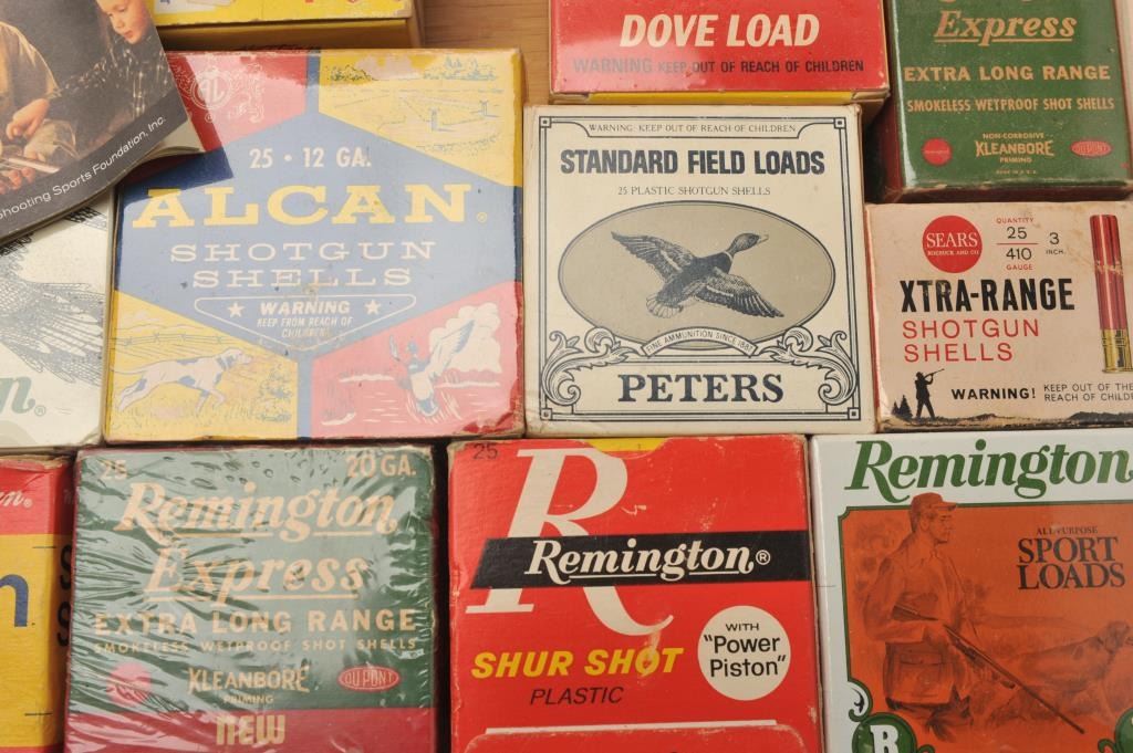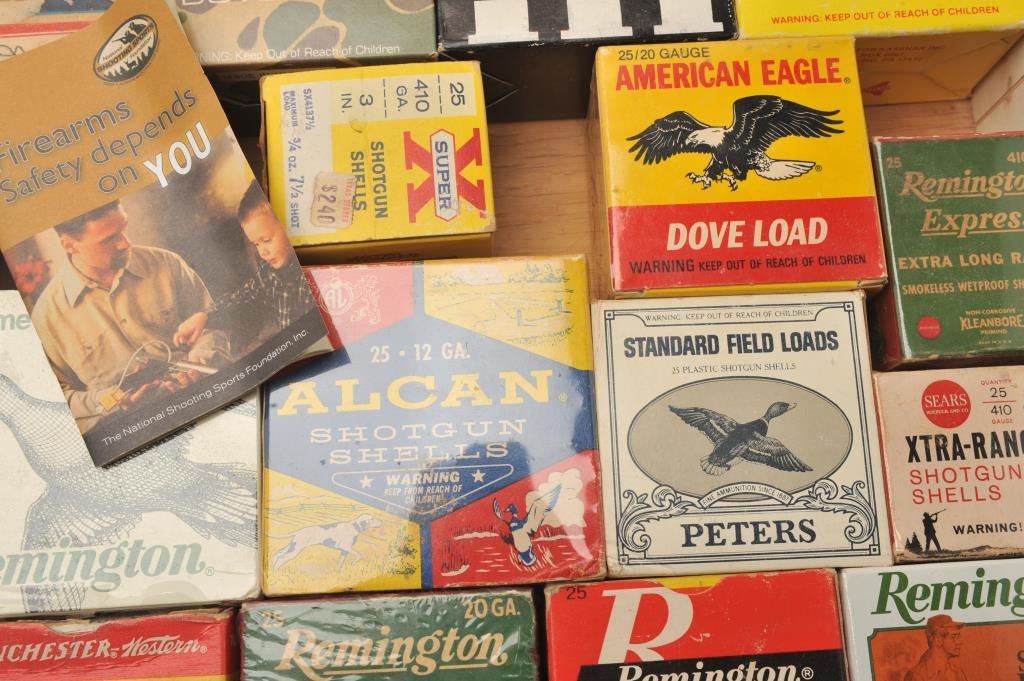 Lot of nine empty vintage shotshell boxes and nine full boxes. The lot includes empty boxes by Alcan, American Eagle, Federal, Peters, Remington and Winchester. The loaded shells include 4 boxes of 12 gauge gameloads, three boxes of 20 gauge and two boxes of .410 by makers like, Concorde, Remington and Sears, among others. Est.: