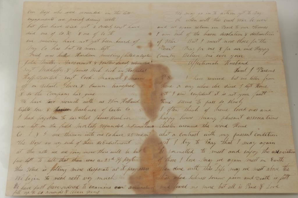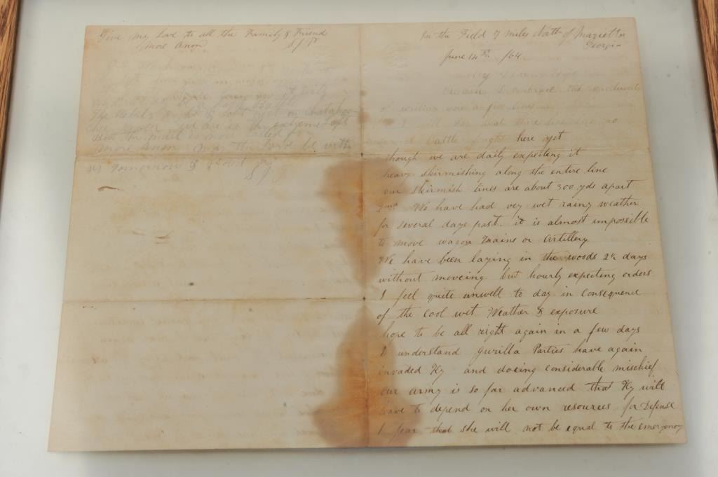 Two sided framed Civil War letter dated June 14, 1864, from Samuel J. Parsons, Sgt. 23rd Kentucky Infantry to his wife, from “the field 7 miles North of Marietta, Georgia”; addresses the weather, conditions in camp and battle, losses, MIA’s, etc. Document shows some staining at folds but very readable. Accompanied by a file of National Archives copies of Parsons, record, unit and pension. Est.: $75-$150.