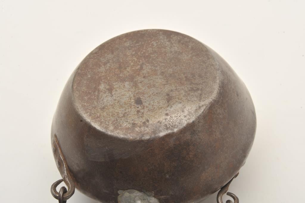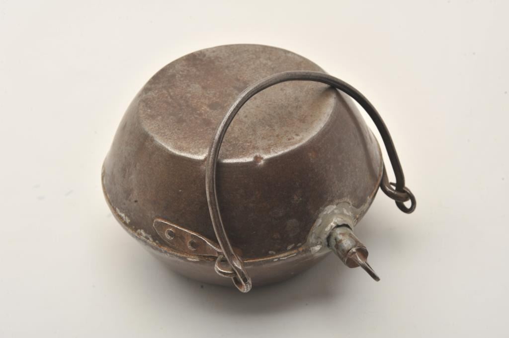 Large antique iron canteen, approximately 9” diameter and 5” in depth with iron handle; spout has been repaired; possible for use in a wagon as somewhat large for a person or soldier to carry. Est.: $250-$500.