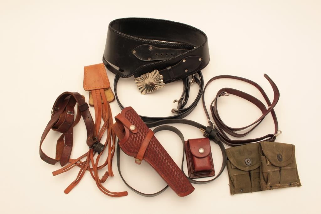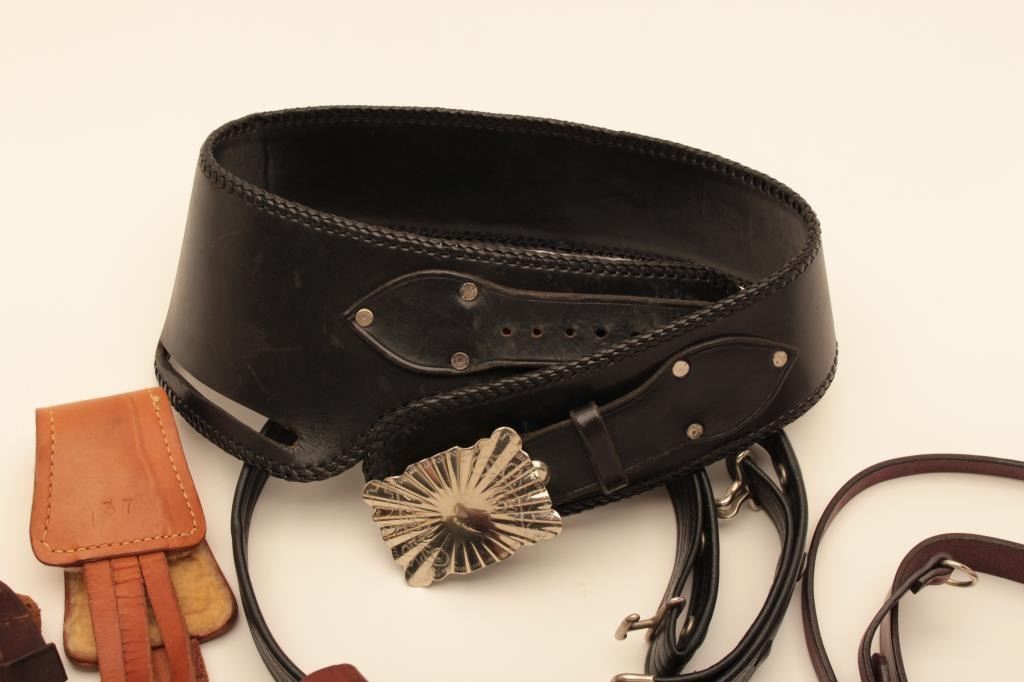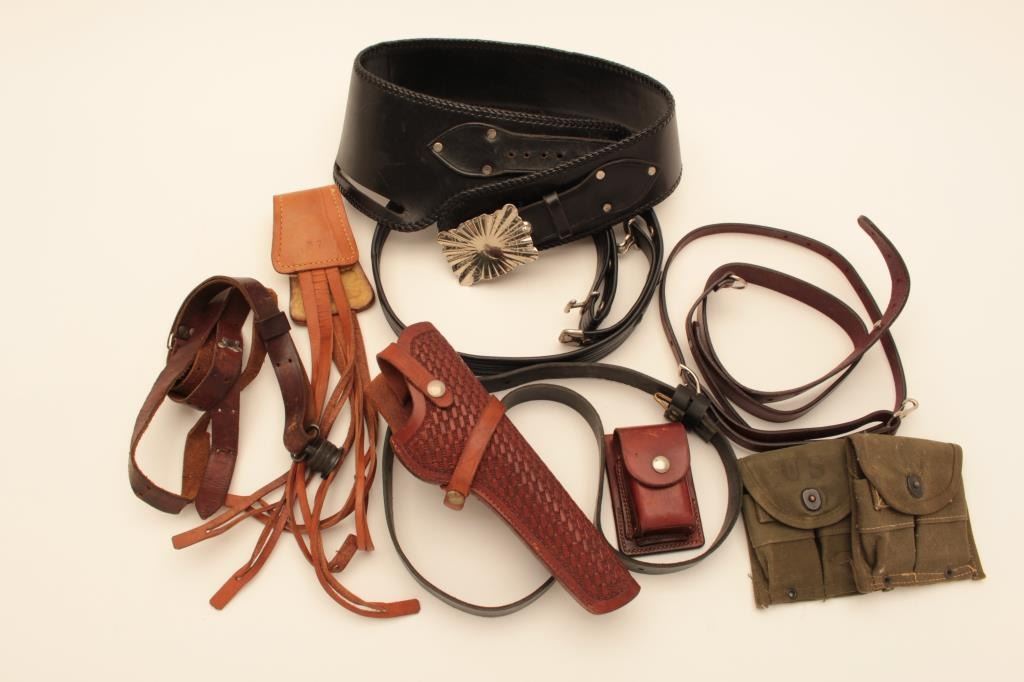 Bonanza leather lot including a leather basket weave holster by Viking, several leather belts, leather gun fighter belt with silver tone buckle, magazine pouch, rifle sling and two OD green canvas magazinepouches for a 1911. Est.: $30-$60.