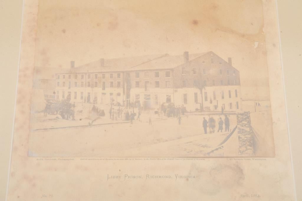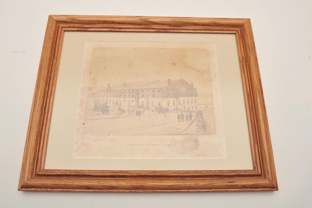 Framed and matted print of Libby Prison, Richmond, Virginia dated April, 1864; approximately 13.5” x 16.5” overall; scattered foxing and some staining; approximately 90%+ image still visible. Est.: $25-$50.