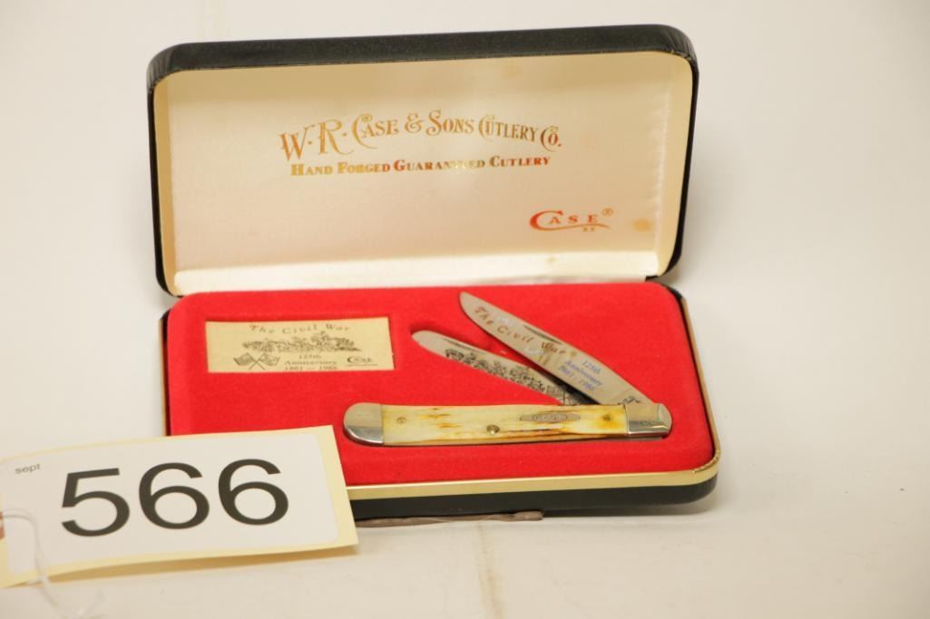 Knife with 2 blades, first blade says "The Civil War 125 th anniversary" the other blade has a battle scene on it with a union jack and the confederate flag.