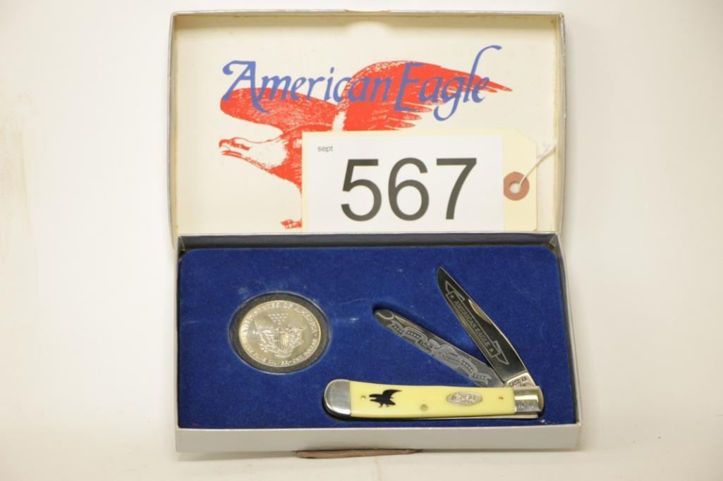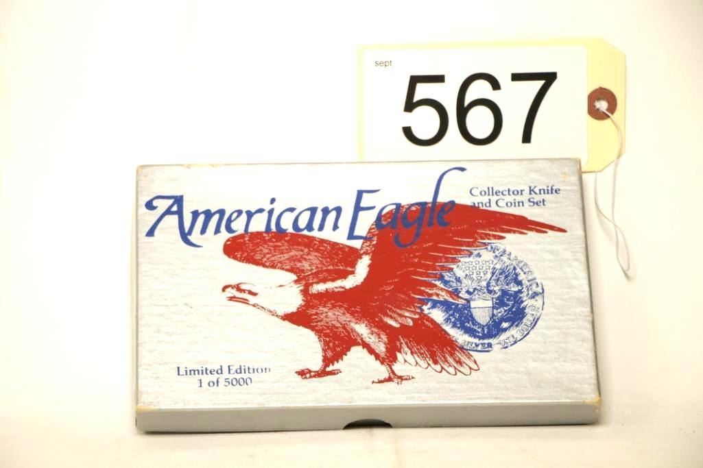 One knife with two blades, one blade is engraved with the word "American Eagle" and the other knife says "1 of 5000" comes with silver dollar.