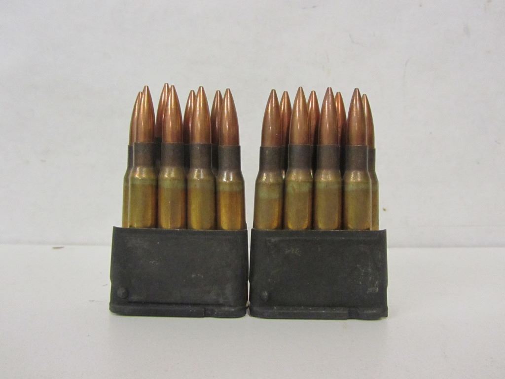 TWO M1 GARAND STRIPPER CLIPS LOADED WITH 30-06 SPRG, 8 ROUNDS PER CLIP, 16 ROUNDS TOTAL.