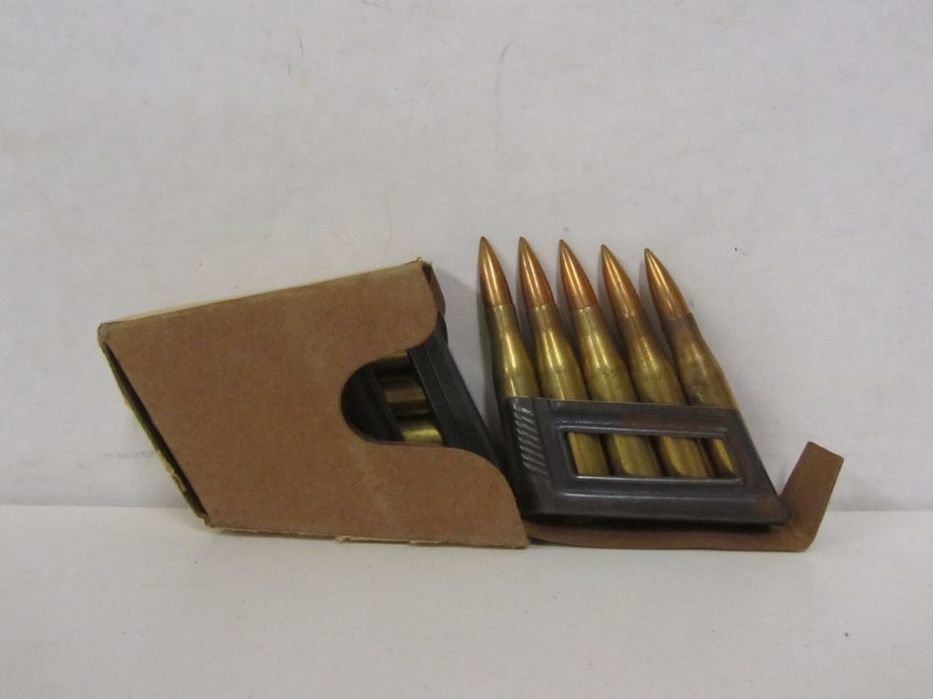 TWO 15 ROUND PACKS OF 8X57 MAUSER, ONE 10 ROUND PACK IN STRIPPER CLIPS OF 8X56 RS MANNLICHER 1938 NAZI STAMPED, ONE 16 ROUND PACK OF 9MM LUGER.