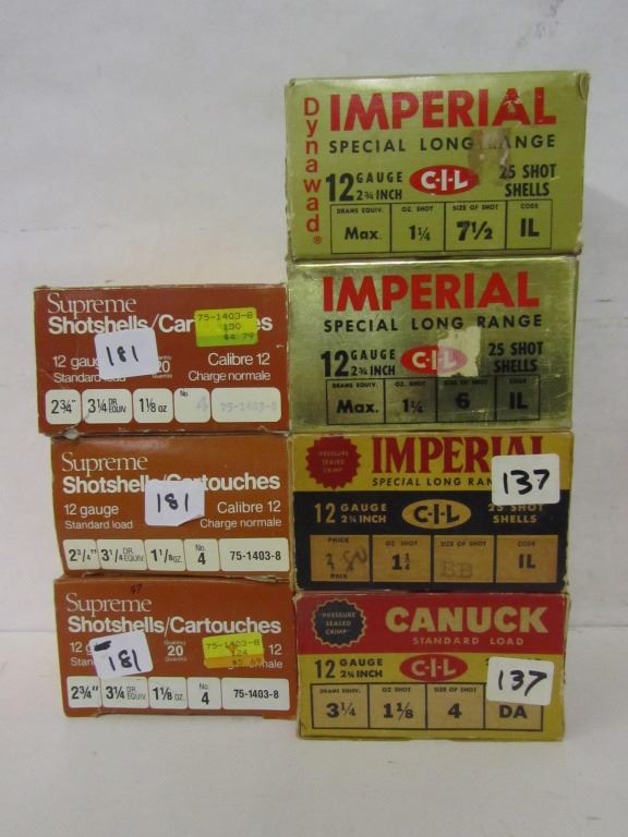 ONE 25 SHELL BOX OF C-I-L CANUK STANDARD LOAD 12GA 3.25" #4 WITH AN ASSORTMENT OF #6 AND #7 SHELLS INSIDE, ONE 25 SHELL BOX OF C-I-L IMPERIAL SPECIAL LONG RANGE 12GA 2 3/4" BB WITH 24 ORIGINAL SHELLS AND ONE REMINGTON RXP 12GA 2 3/4" #4 WITH 18 SHELLS INSIDE, ONE 20 SHELL BOX OF SUPREME 12GA 2 3/4" #4 WITH 17 SHELLS INSIDE, ONE 20 SHELL BOX OF SUPREME 12GA 2 3/4" #4 WITH 20 SHELLS INSIDE.