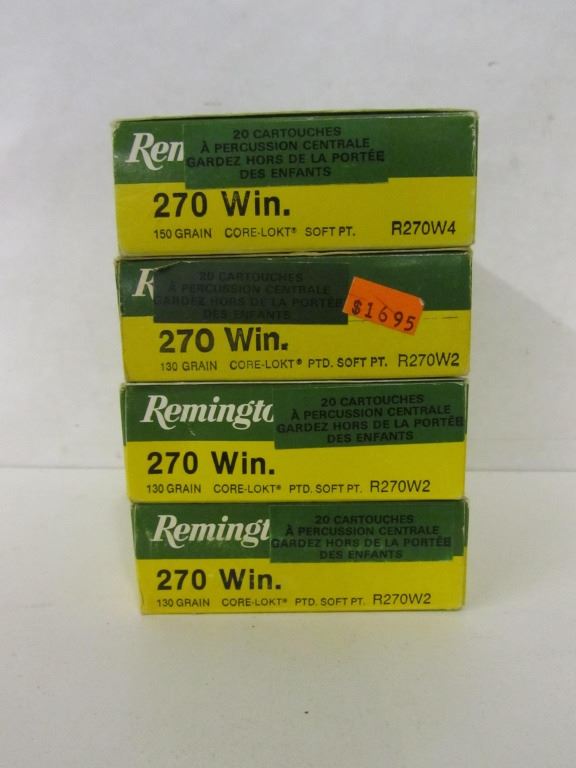 FOUR BOXES OF REMINGTON 270 WIN ONCE FIRED BRASS WITH 74 PIECES (THREE FULL BOXES AND ONE BOX WITH 14 PIECES)