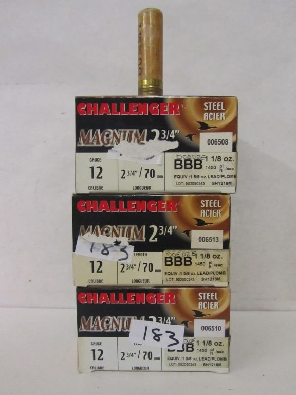 THREE BOXES OF CHALLENGER MAGNUM 12GA 2 3/4" BBB STEEL SHOT, ONE CANUCK 20GA DUMMY SHELL.