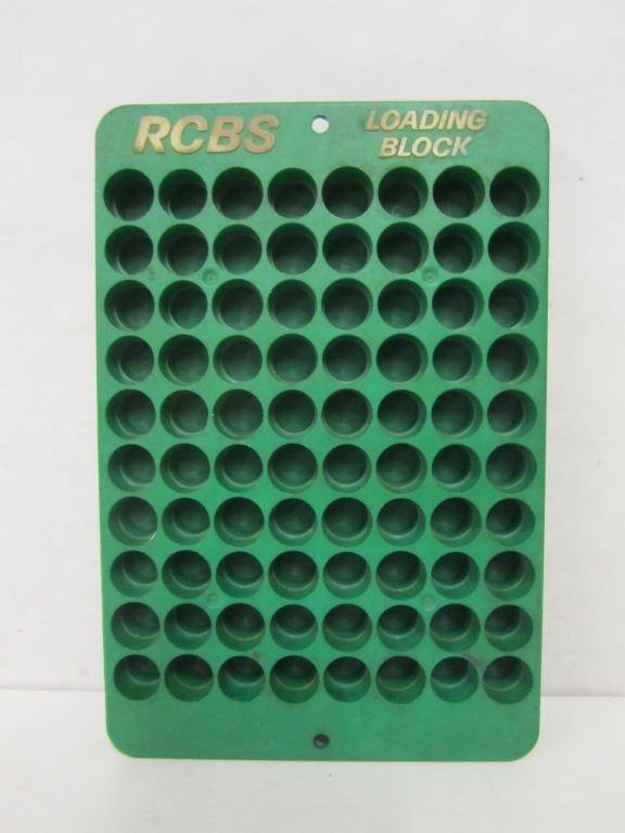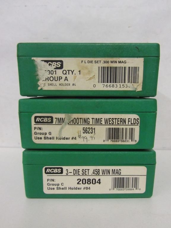 ONE SET OF RCBS 300 WIN MAG RELOADING DIES #UNREADABLE, ONE RCBS 7MM RELOADING DIE SET #56231, ONE RCBS .458 WIN MAG RELOADING DIE SET #20804, ONE MTM CASE GUARD 150, ONE RCBS CASE LOADING BLOCK.