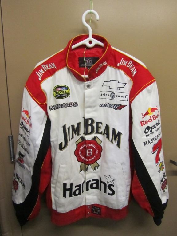 JH DESIGN ROBBY GORDON NASCAR NEXTEL CUP SERIES JACKET SIZE MEDIUM SPONSORS LISTED ARE JIM BEAM, HARRAHS, RED BULL, OZARK MOTOR LINES INC, MASTERCRAFT, SUNDCO, JACOBSEN, TEXTRON, SAFETY KLEEN,