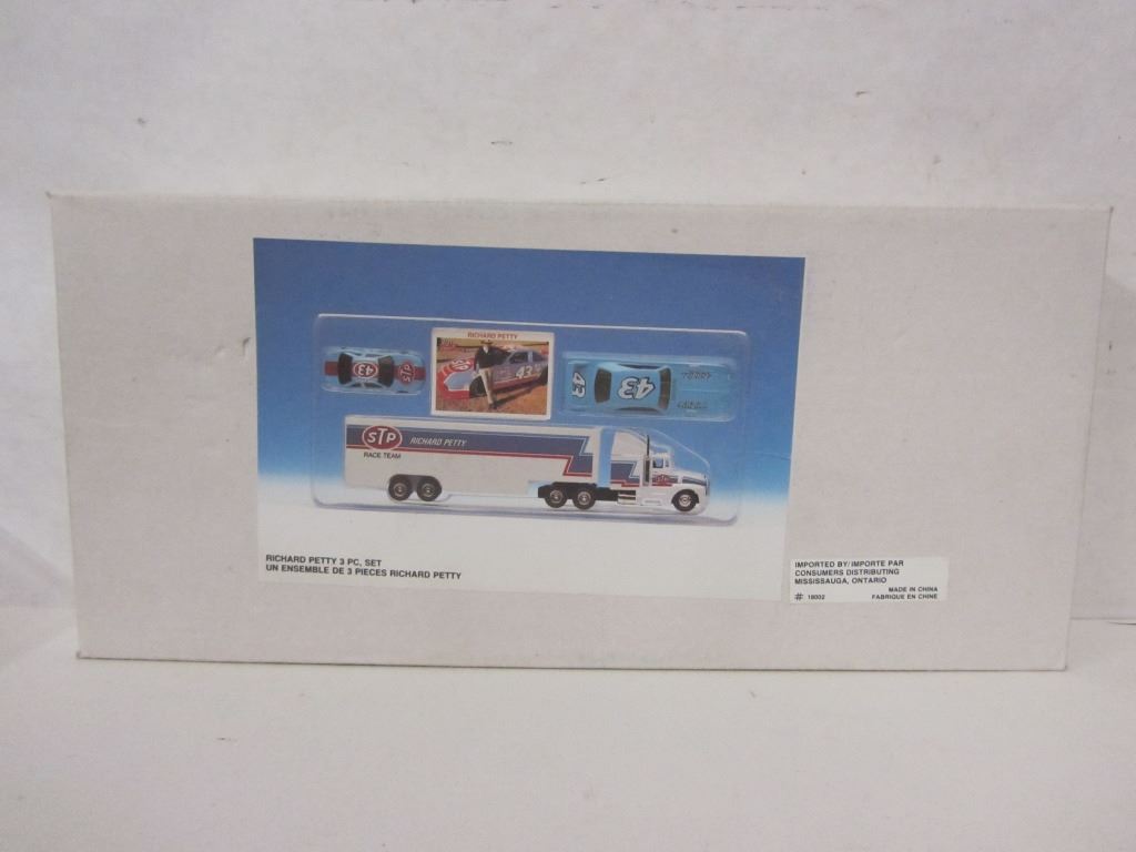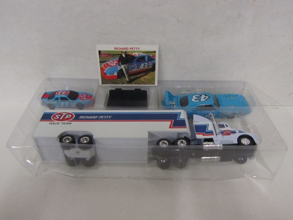 RICHARD PETTY THREE PIECE DIE CAST SET, ONE DIE CAST TRANSPORTER, ONE DIE CAST STOCK CAR, ONE DIE CAST PLYMOUTH, ONE RICHARD PETTY TRADING CARD