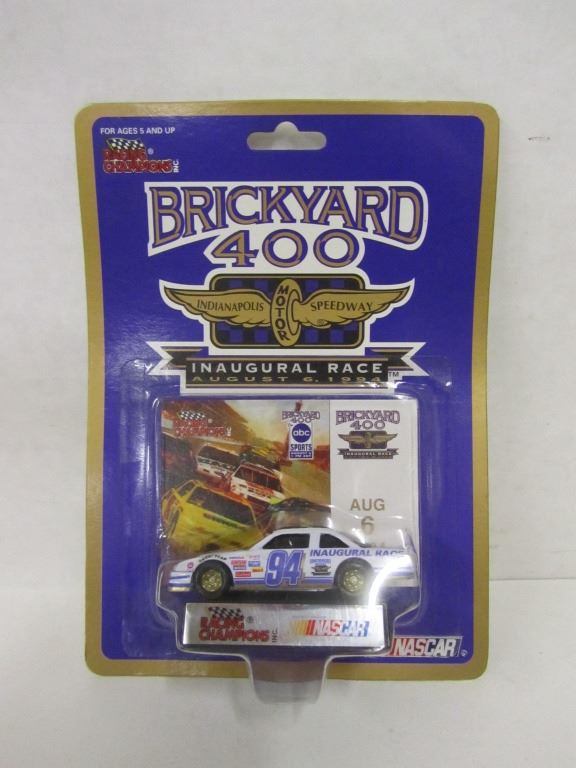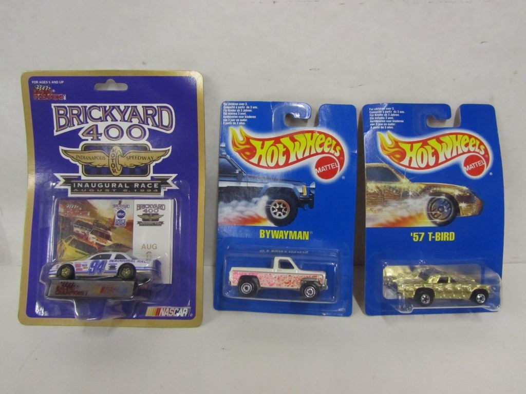 ONE BRICKYARD 400 INDIANAPOLIS MOTOR SPEEDWAY INAUGURAL RACE OF AUGUST 6TH 1994 DIE CAST CAR WITH DISPLAY STAND, ONE HOTWHEELS BYWAYMAN DIE CAST PICKUP TRUCK, ONE HOTWHEELS '57 T-BIRD DIE CAST CAR.