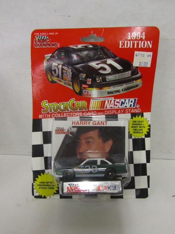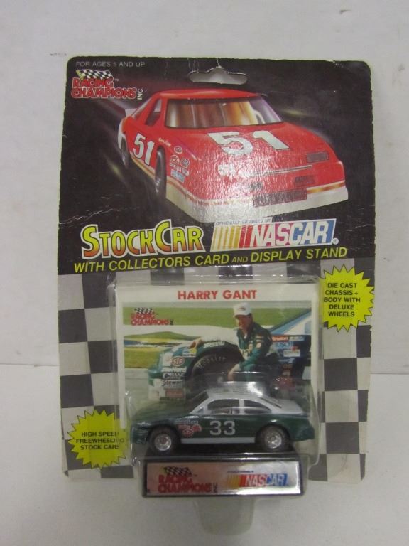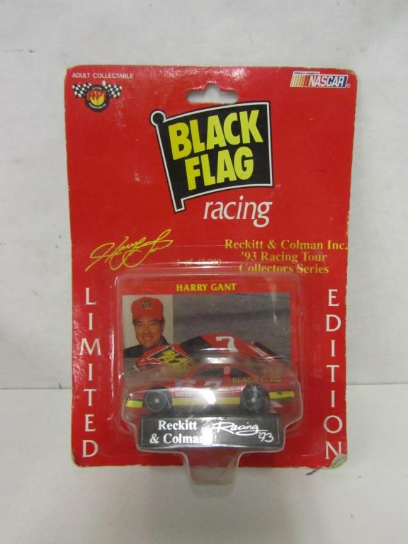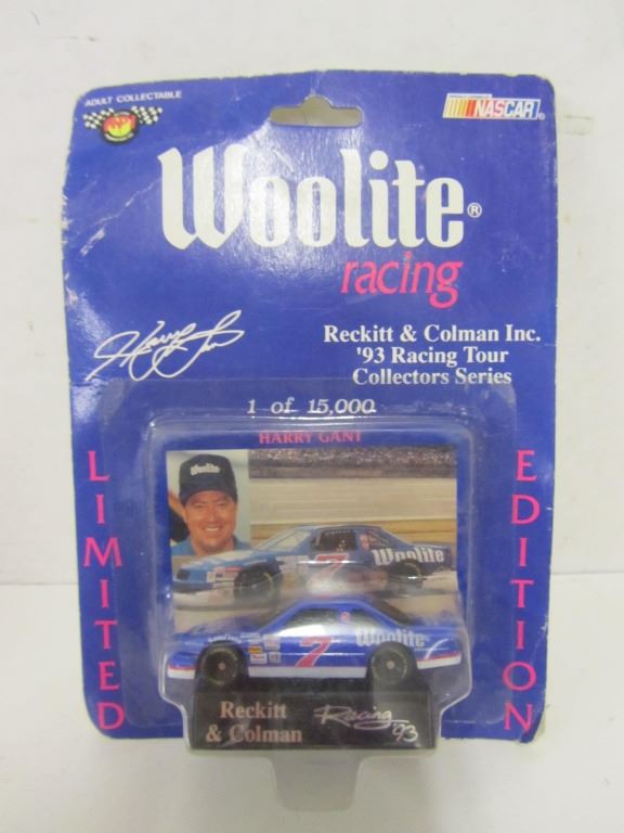 ONE HARRY GANT #33 1:64TH SCALE DIECAST STOCK CAR WITH DISPLAY STAND AND COLLECTORS CARD (IN UNOPENED PACKAGE), ONE BLACK FLAG RACING HARRY GANT #7 1:64TH SCALE DIE CAST STOCK CAR FROM 1993 RECKITT & COLMAN INC RACING TOUR HARRY GANT #7 WOOLITE RACING 1:64TH SCALE DIE CAST STOCK CAR WITH DISPLAY STAND AND COLLECTORS CARD FROM RICKETT & COLMAN INC. 1993 RACING TOUR COLLECTORS SERIES 1 OF 15,000 (IN UNOPENED PACKAGE).