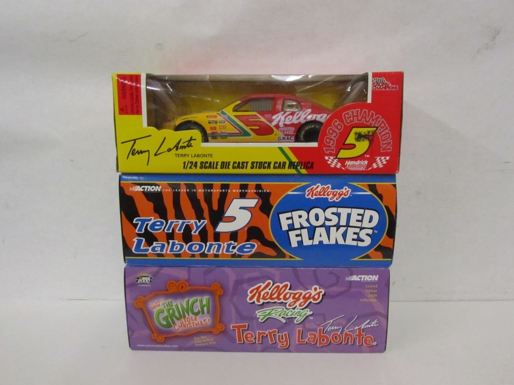 ONE TERRY LABONTE #5 1996 CHAMPION 1:24TH SCALE DIE CAST STOCK CAR REPLICA, ONE TERRY LABONTE #5 1:24TH SCALE DIE CAST 2000 MONTE CARLO FROSTED FLAKES BRANDED, ONE TERRY LABONTE #5 1:24TH SCALE DIE CAST 2000 MONTE