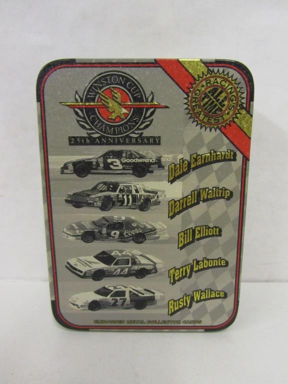 ONE FIVE METAL CARD SET OF WINSTON CUP CHAMPIONS FOR THE 25TH ANNIVERSARY OF THE WINSTON CUP. INCLUDES: DALE EARNHARDT, DARREL WALTRIP, BILL ELLIOTT, TERRY LABONTE, AND RUSTY