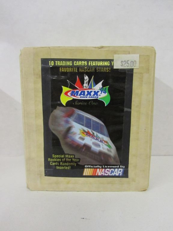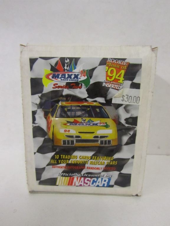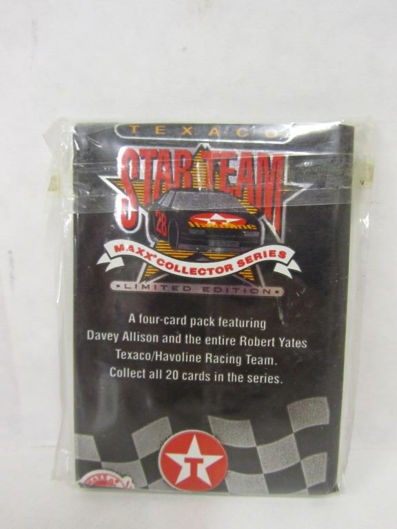 ONE UNOPENED FOUR CARD PACK OF TEXACO STAR TEAM MAXX COLLECTOR SERIES LIMITED EDITION FEATURING DAVEY ALLISON AND THE ENTIRE ROBERT YATES RACING TEAM, ONE BOX OF MAXX RACE CARDS WITH 10 ROOKIE CLASS OF '94 TRADING PACKS, TWO MARK MARTIN PACKS, TWO KYLE PETTY PACKS, TWO NED JARRETT PACKS, AND TWO ERNIE IRVAN PACKS.