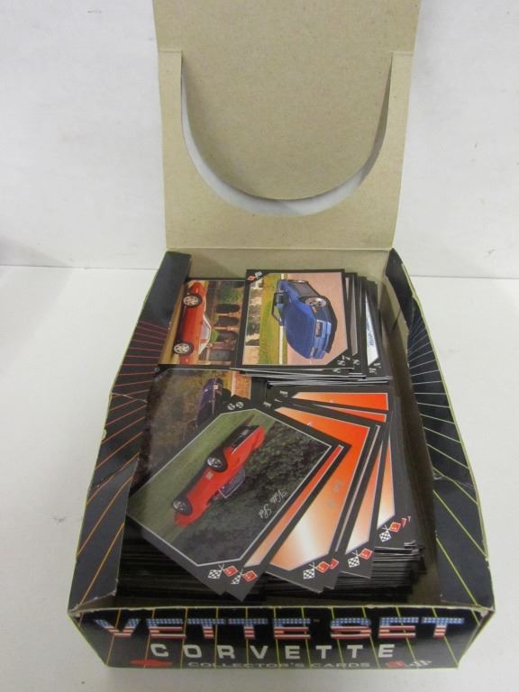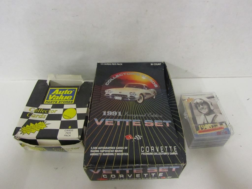 ONE BOX OF AUTO VALE COLLECTOR CARDS WITH THREE RACING CHAMPIONS CARD AND 7 UNOPENED PACKS OF AUTO VALE CARDS AS WELL AS 75 OPENED AUTO VALE CARDS, ONE BOX OF 1991 INAUGURAL VETTE SET CORVETTE COLLECTOR CARDS WITH 360