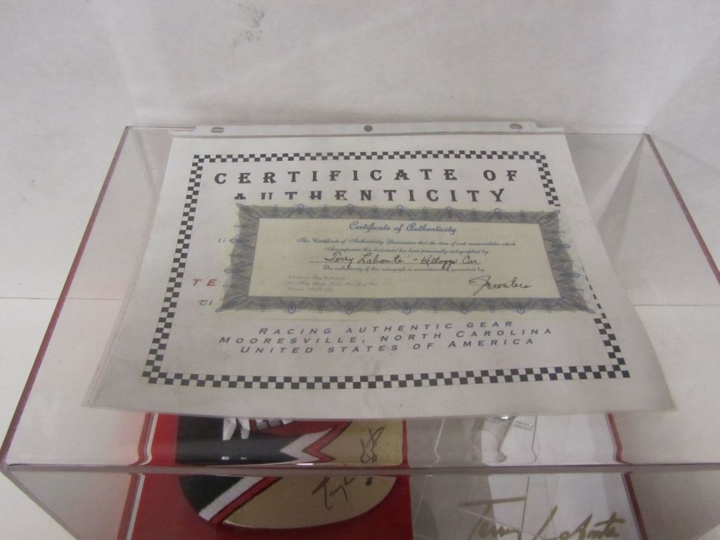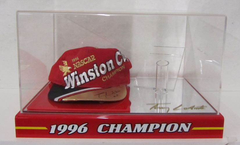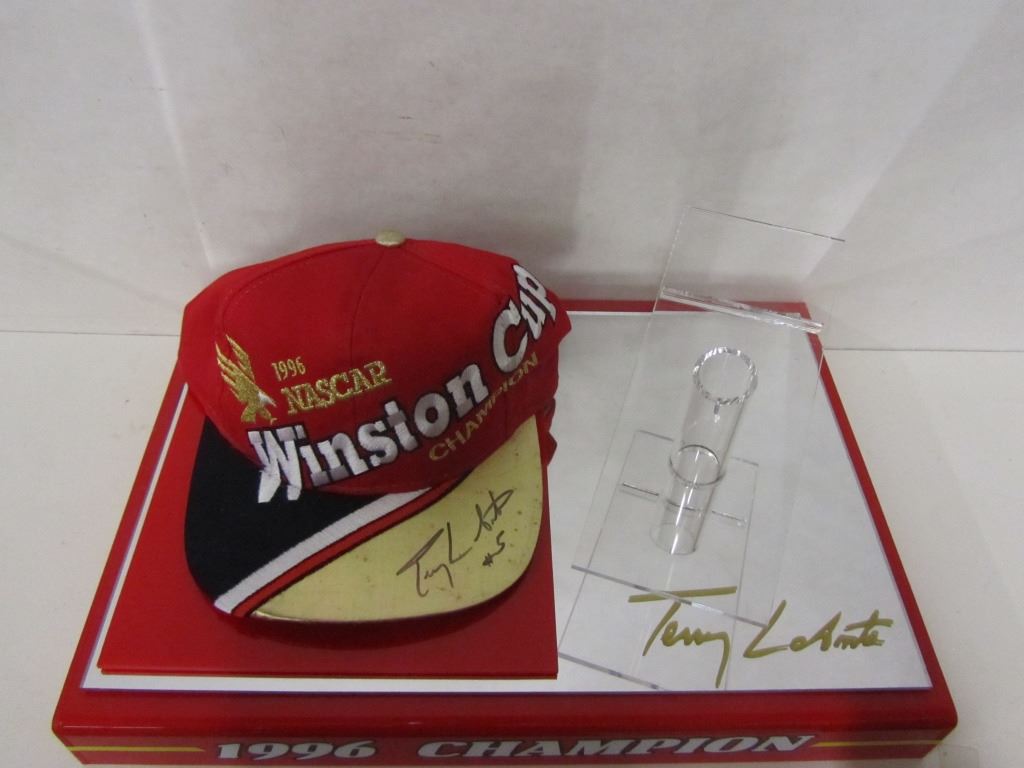 ONE SIGNED TERRY LABONTE 1996 NASCAR WINSTON CUP CHAMPIONSHIP HATE WITH DISPLAY CASE AND DISPLAY STAND FOR 1:24TH SCALE DIE CAST STOCK CAR (NO CAR INCLUDED) HAS CERTIFICATES OF AUTHENTICITY